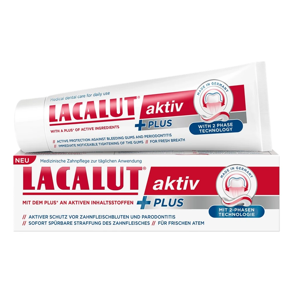 Lacalut aktiv PLUS toothpaste contains the proven Lacalut aktiv formula in a higher active ingredient concentration*. Fluoride effectively protects against tooth decay.