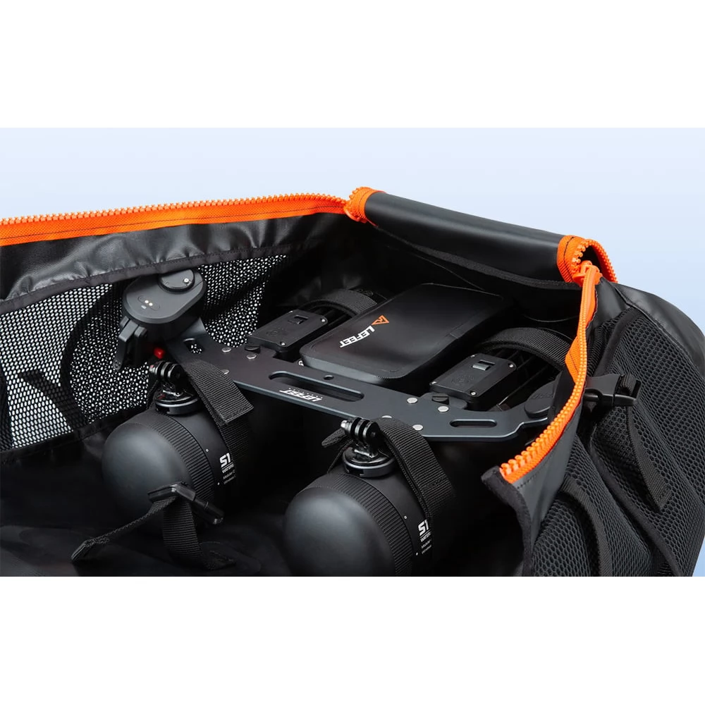 You get the opportunity to conveniently transport the S1 Pro underwater scooter together with the necessary accessories. The practical backpack from the Lefeet brand helps with this! With a capacity of up to 45 litres, you can easily fit everything you need inside, and the waterproof pockets allow you to safely carry items such as your phone, headphones or keys. The set also includes two scooter battery bags. All are waterproof and have space for the battery and charger.