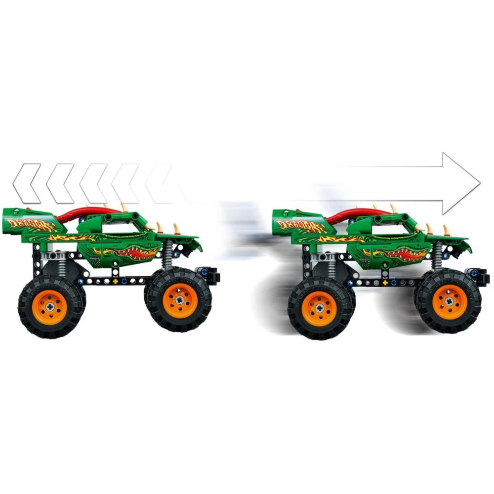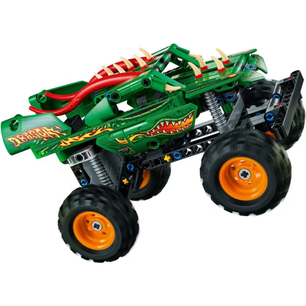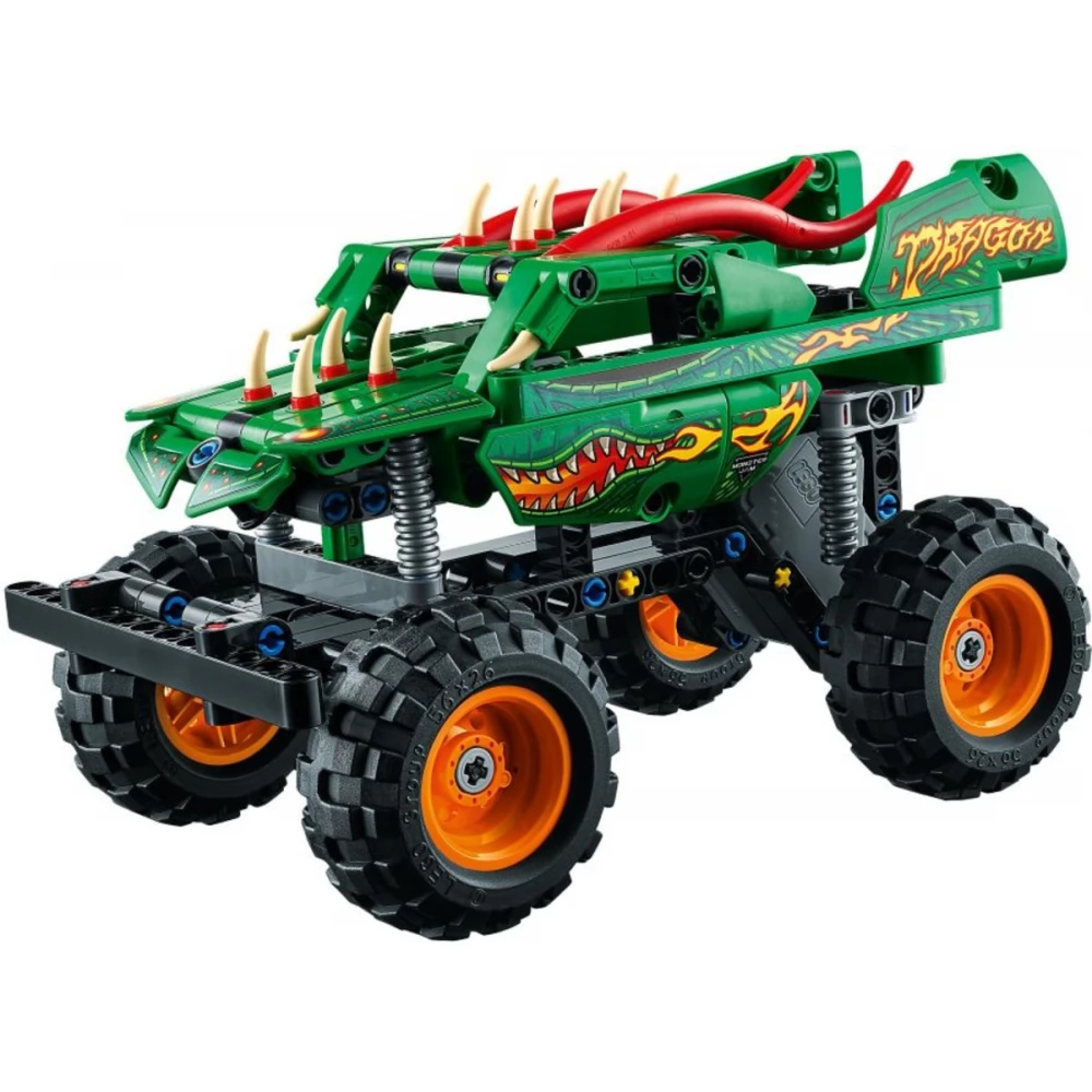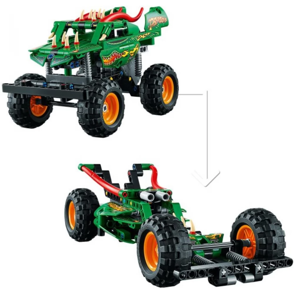 A fun building experience for monster truck fans with a 2-in-1 model. The LEGO Technic Monster Jam Dragon truck transforms into a Crocodile sand runner. The set includes edgy, dragon-like details, including spikes and horns. Decorated with realistic graphics and colors, kids can play out their favorite scenes from the Monster Jam arena. 2-in-1 model for even more play When kids are ready for something new, they can build this 2-in-1 Monster Jam truck into a Crocodile sand runner. With the pull-back engine, children can race with the truck, and they can also perform tricks seen in the real Monster Jam arena. A great introduction to engineering LEGO Technic building models feature realistic movements and structures that introduce LEGO builders to the world of engineering in an approachable and realistic way. Get ready for a simple and intuitive building adventure with the LEGO Builder app! In the app, kids can zoom in and rotate 3D versions of models, save kits and track their progress.