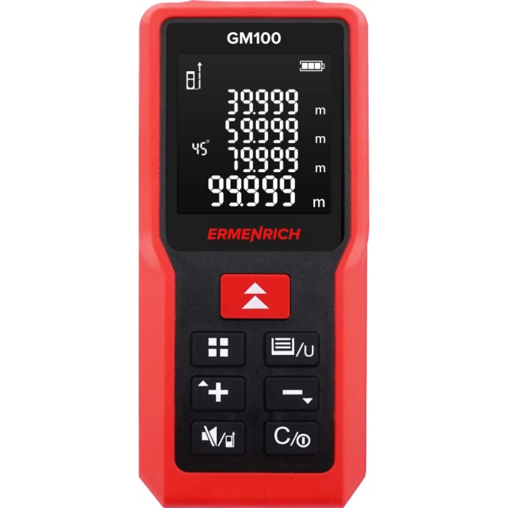 The Ermenrich Reel GM100 is a laser measuring instrument designed for measurements on construction and renovation sites. It can also be used for land boundary surveys, surveying work and other applications where accurate measurement of the linear size, area and volume of an object is required. The maximum measurable distance is 100 meters. The laser meter can also be used as a laser protractor. Thanks to the Pythagorean theorem function, it automatically calculates the distances after intermediate measurements. This function is especially useful when the laser cannot be positioned directly by extending it between the two points.