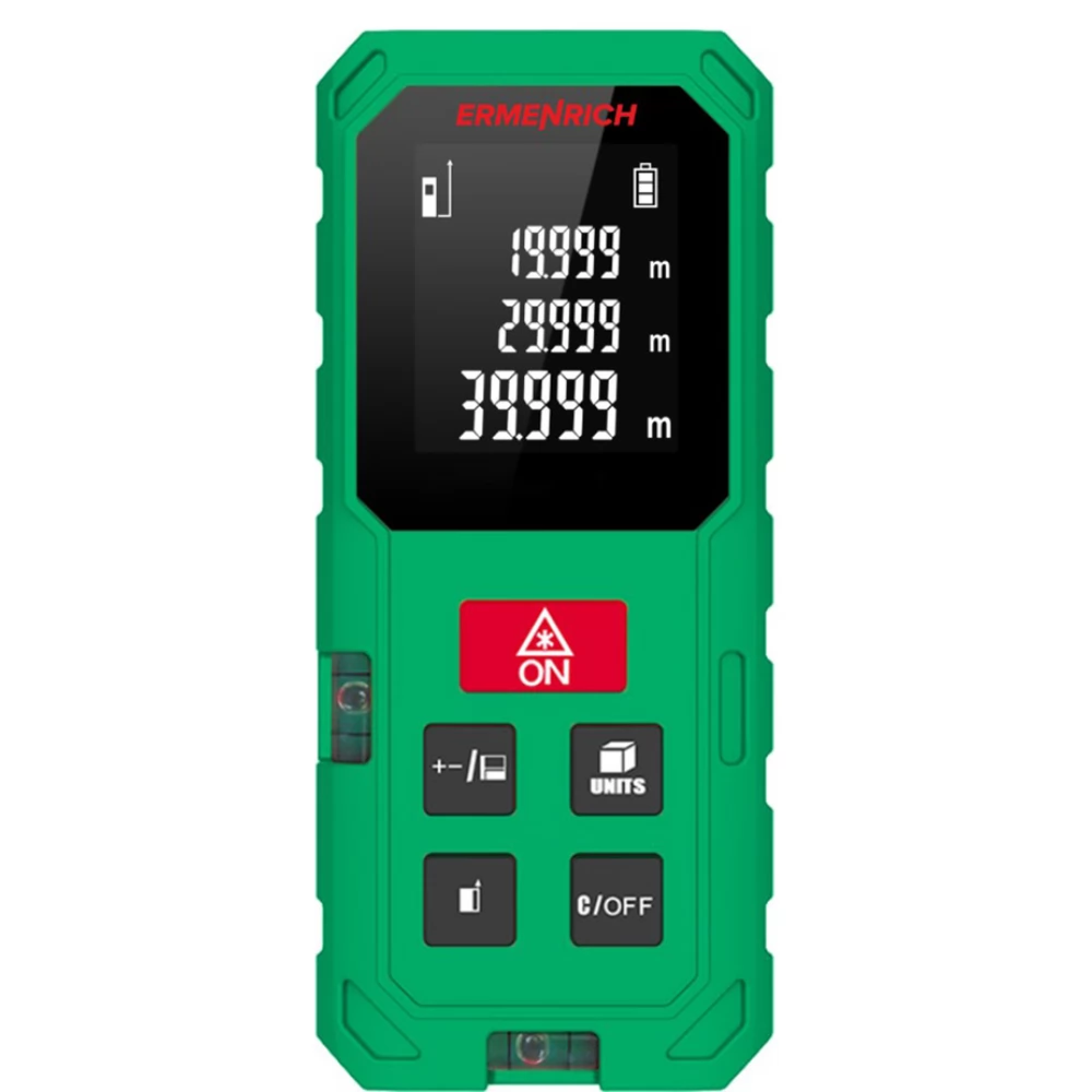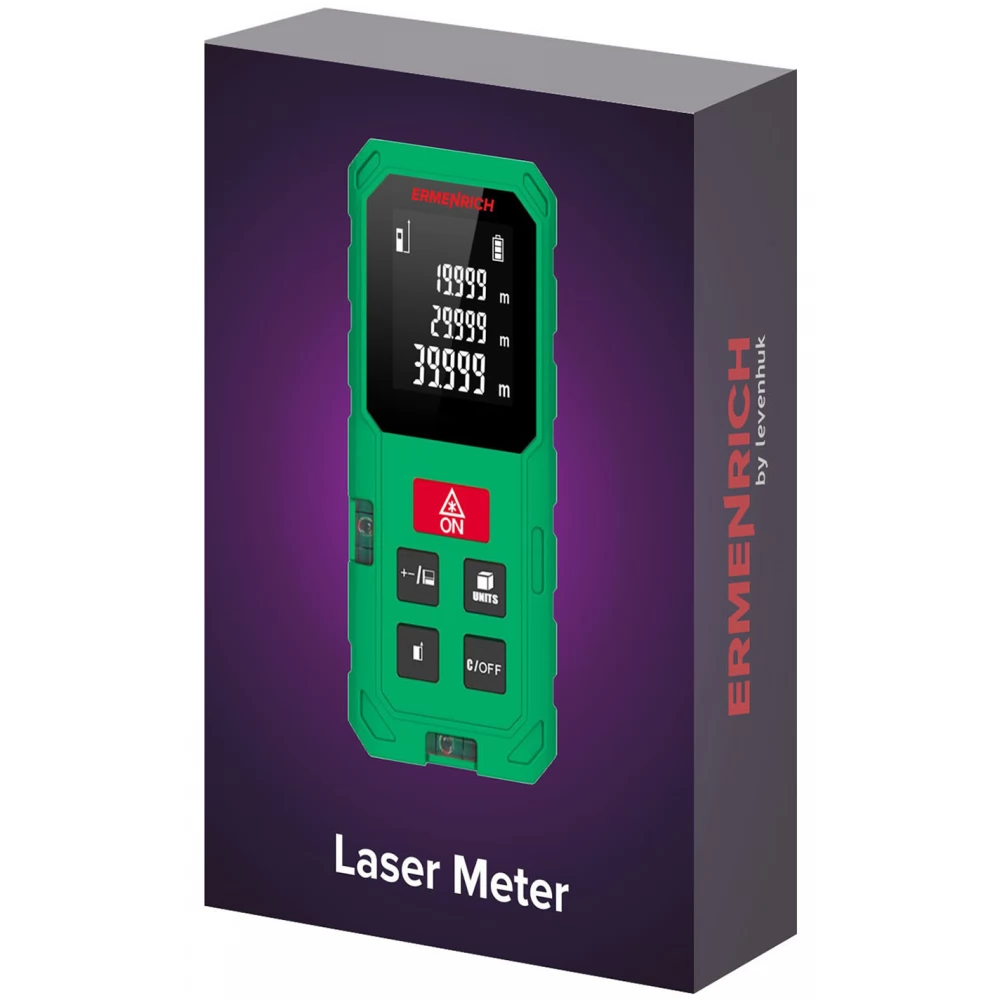 The Ermenrich Reel GS100 is a modern laser measurer for accurate and convenient measurement of distances, volumes and areas. The indirect calculation function using the Pythagorean theorem allows you to calculate the distance even if there is an obstacle in the path of the laser or if the device cannot be placed in the desired position. This function uses additional measurements to calculate the desired distance with maximum accuracy.
