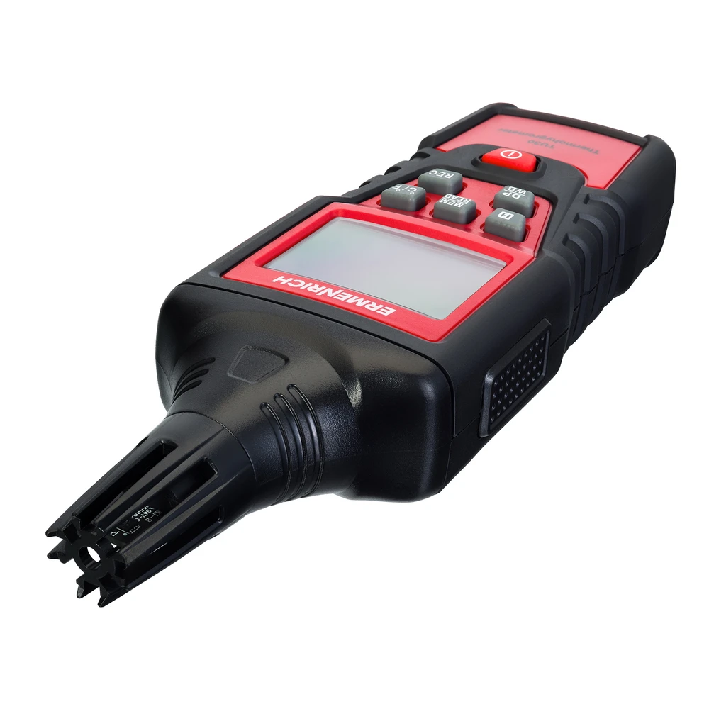 The Ermenrich Wett TU30 temperature and humidity measuring device is used to measure humidity and temperature outdoors, in offices, residential, industrial or warehouse spaces. Its compact design, color screen and battery operation allow you to use the temperature and humidity measuring device for operational measurements and control of production processes.