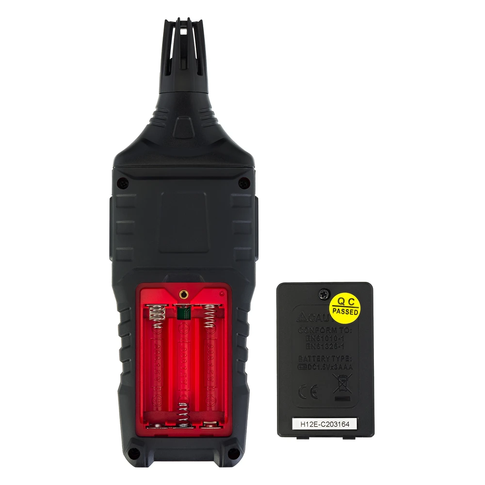 The thermometer measures the temperature between -20 °C and +60 °C. The humidity meter measures humidity between 0% and 100%. The device also measures dew point. It has special functions for freezing data and annotating temperature and humidity limits.