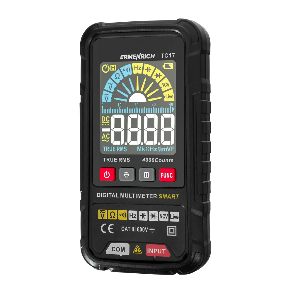 The Ermenrich Zing TC17 digital multimeter is an accurate (True RMS) and compact measuring device for professionals and handymen. It is suitable for diagnostics of electrical networks of apartments, country houses, industrial facilities, offices and cars, as well as for troubleshooting electrical devices. The multimeter fits in your pocket, so you can comfortably take it with you when working in a larger area.