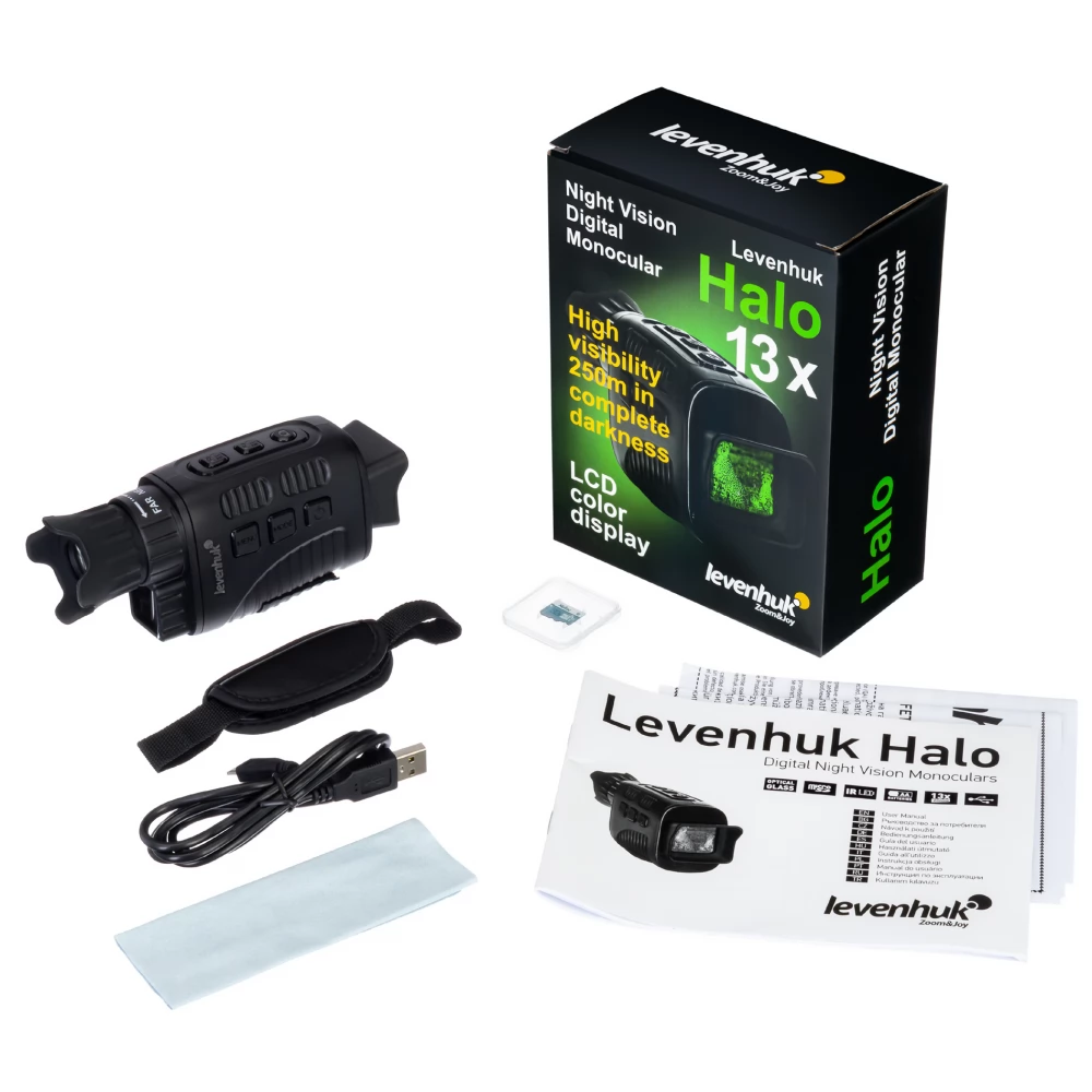 The Levenhuk Halo 13x digital night vision monocular has a built-in recording unit, so it can be used both for visual observations and for taking pictures and videos. The device provides a black-and-white image in total darkness. During the day, when used as an ordinary monocular, it gives a colorful image. The Levenhuk Halo 13x is an excellent choice for night hunting, orienteering, combat games and patrols.