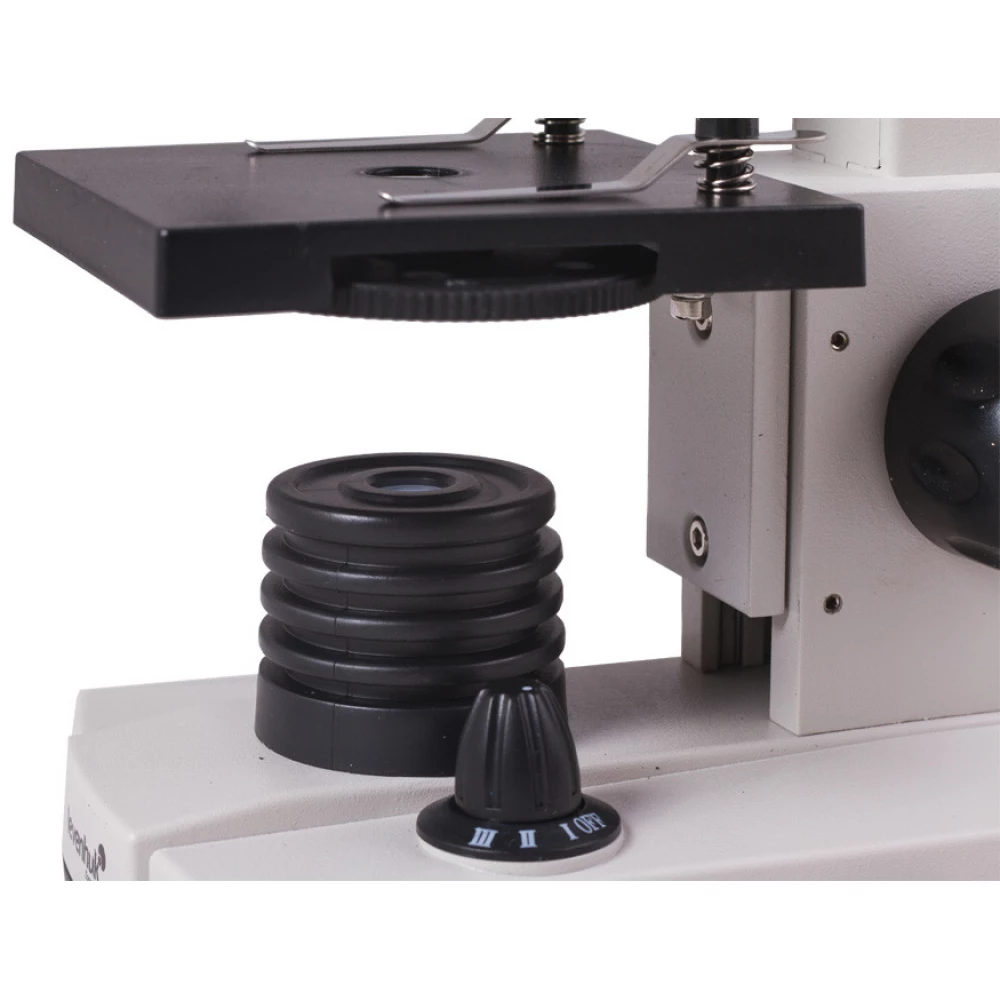 To examine the specimen, place it on the microscope stage and secure it with the two appropriate stage clamps. If the pattern is transparent, such as a thin slice of onion or a mosquito wing, the bottom light should be turned on. If you want to study non-transparent objects - coins, plant leaves or paper - do not forget to turn on the overhead lighting. If you turn on both the lower and upper light sources, you can also study semi-transparent samples. The brightness of the lighting is adjustable, so you can easily set the best lighting for the sample.