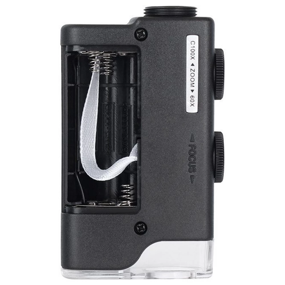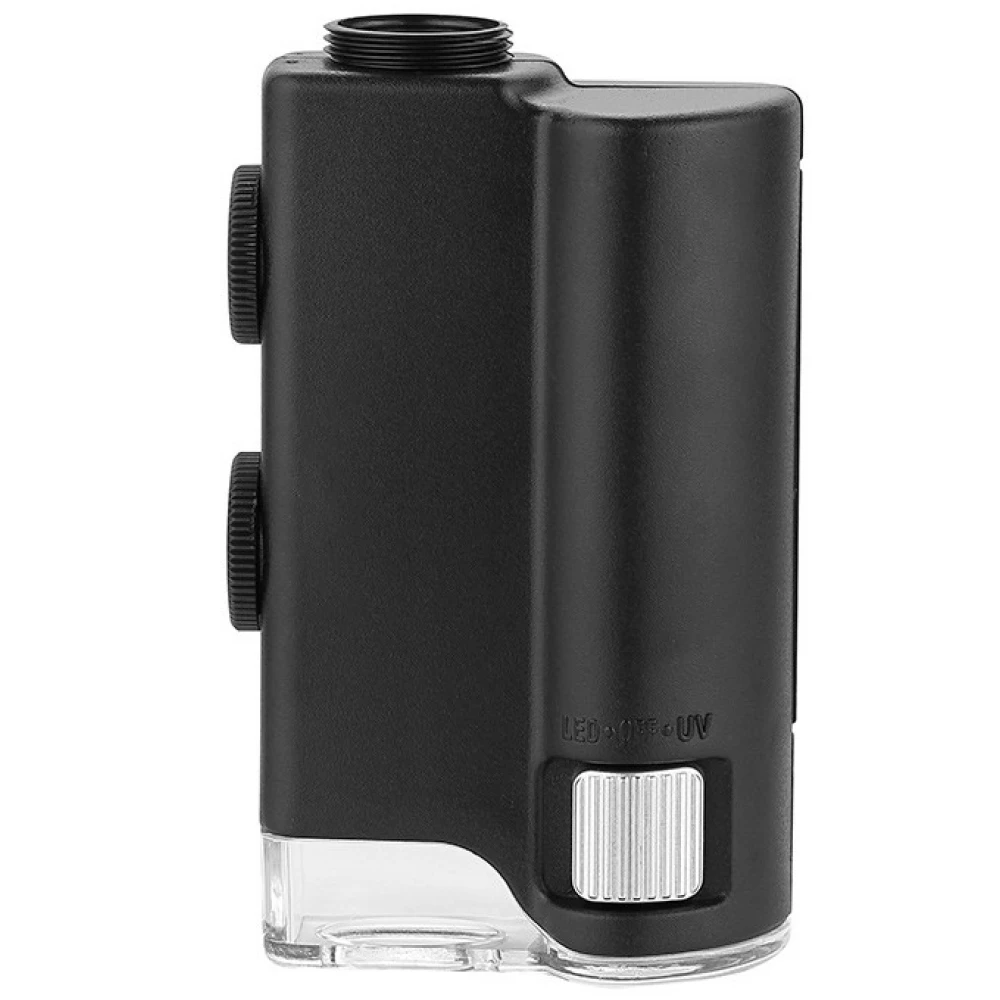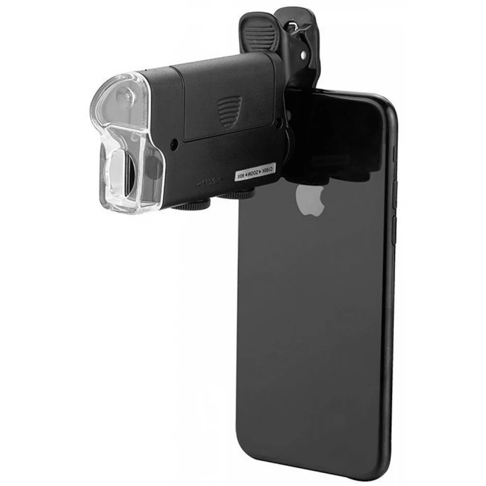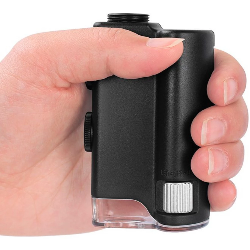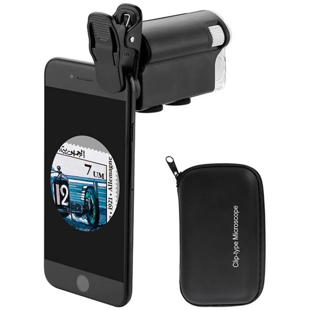 - Pocket microscope with a clip to connect to a mobile device