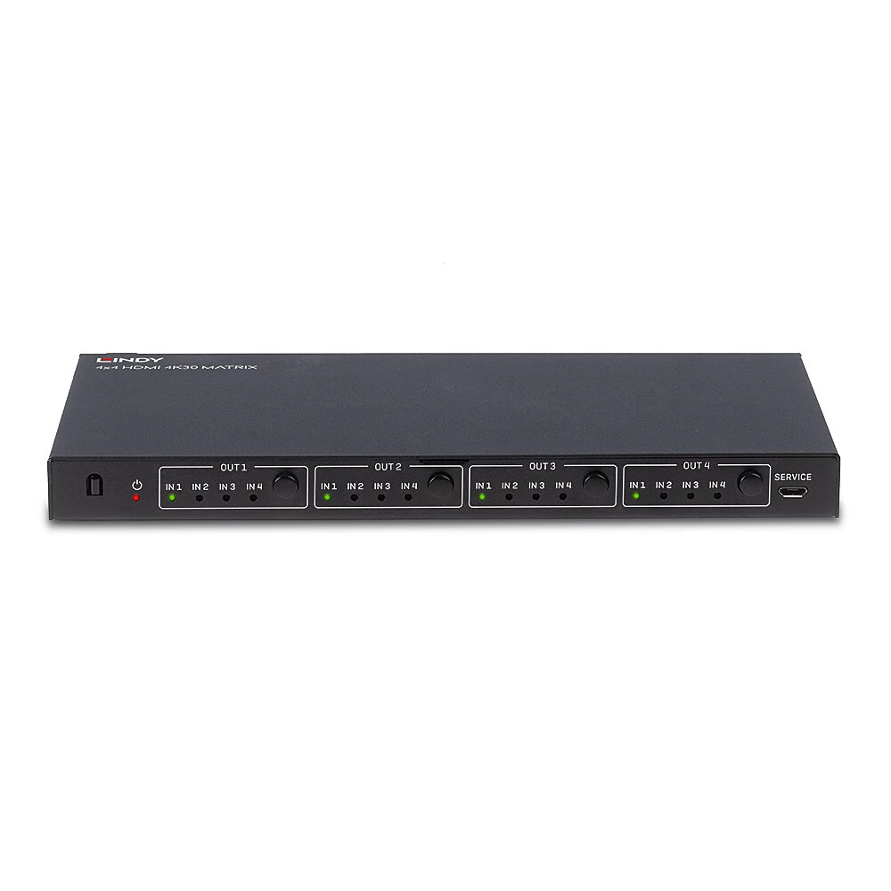 The Lindy 4x4 HDMI 4K30 Matrix is an efficient solution for distributing 4K content from up to 4 HDMI source devices, including PCs and media players, to 4 displays.