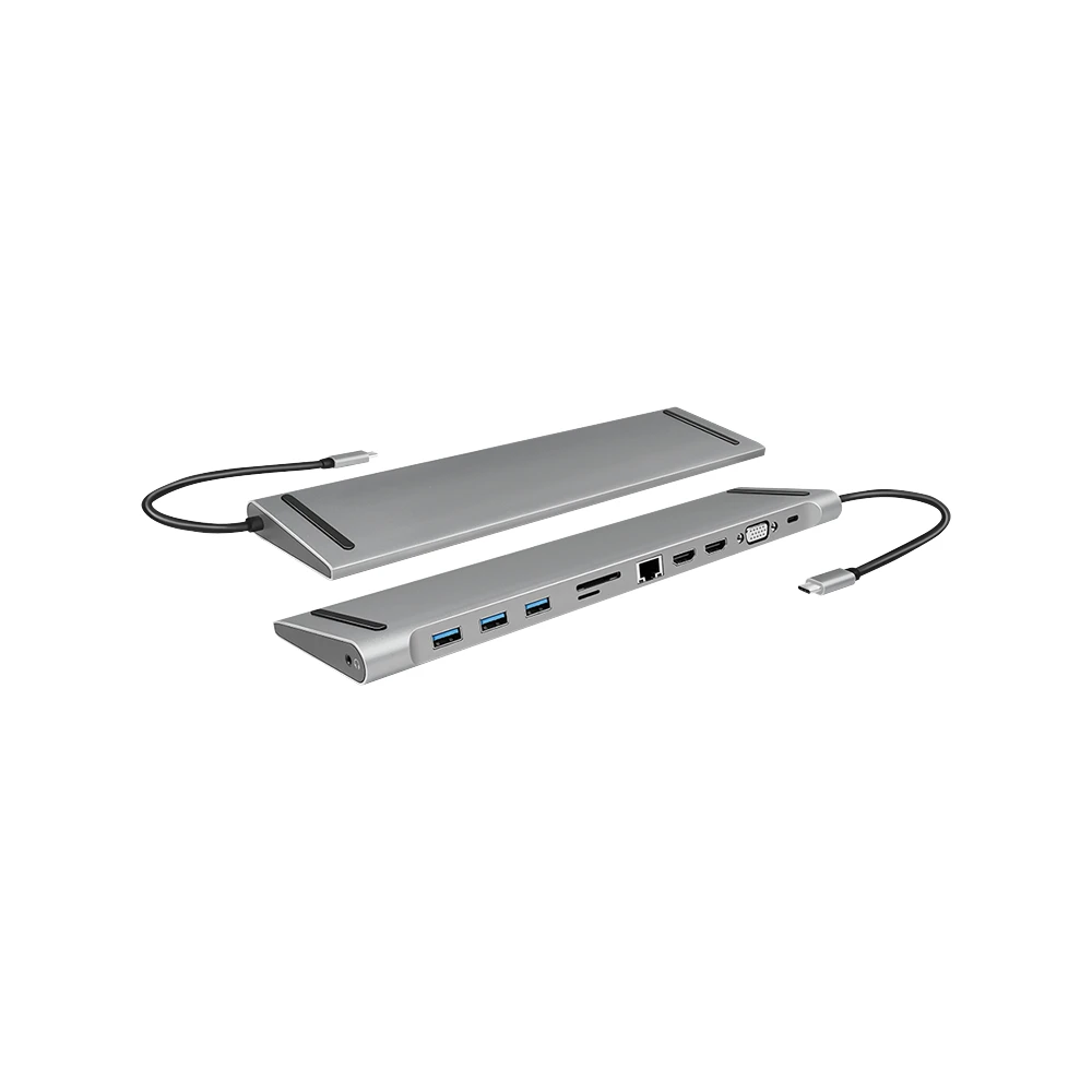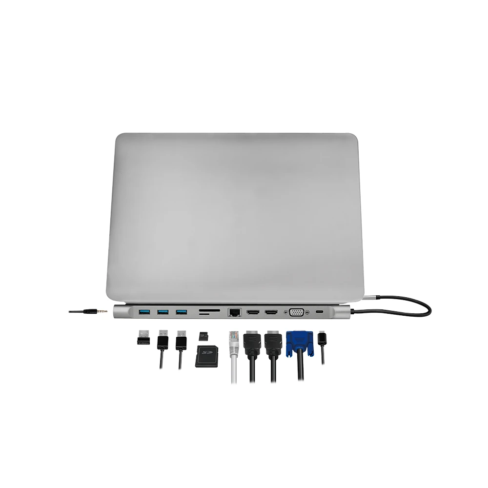 - Output: 1x USB-C PD (socket), 3x 3.0 USB-A (socket), 2x HDMI-A (socket), 1x 3.5 mm audio port (socket), 1x VGA (socket), 1x RJ45 Gigabit Ethernet port (socket), 1x SD/MicroSD card reader