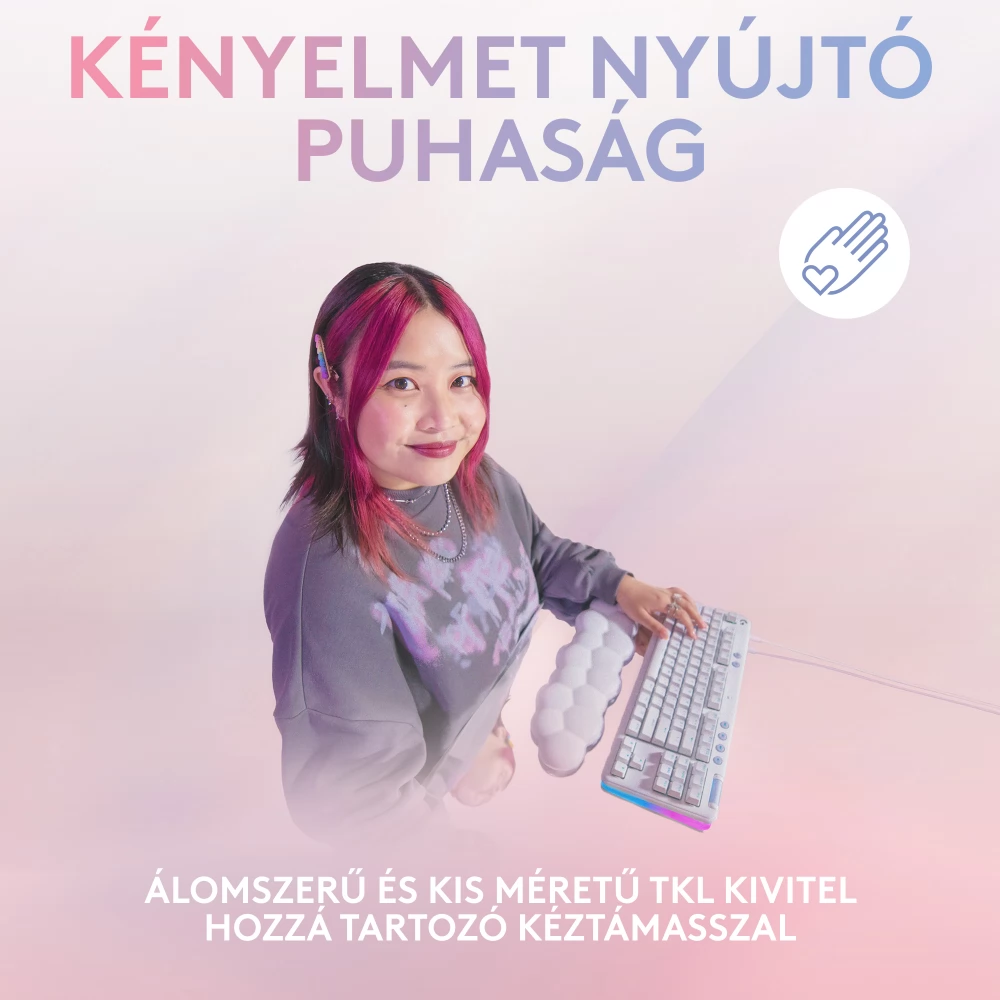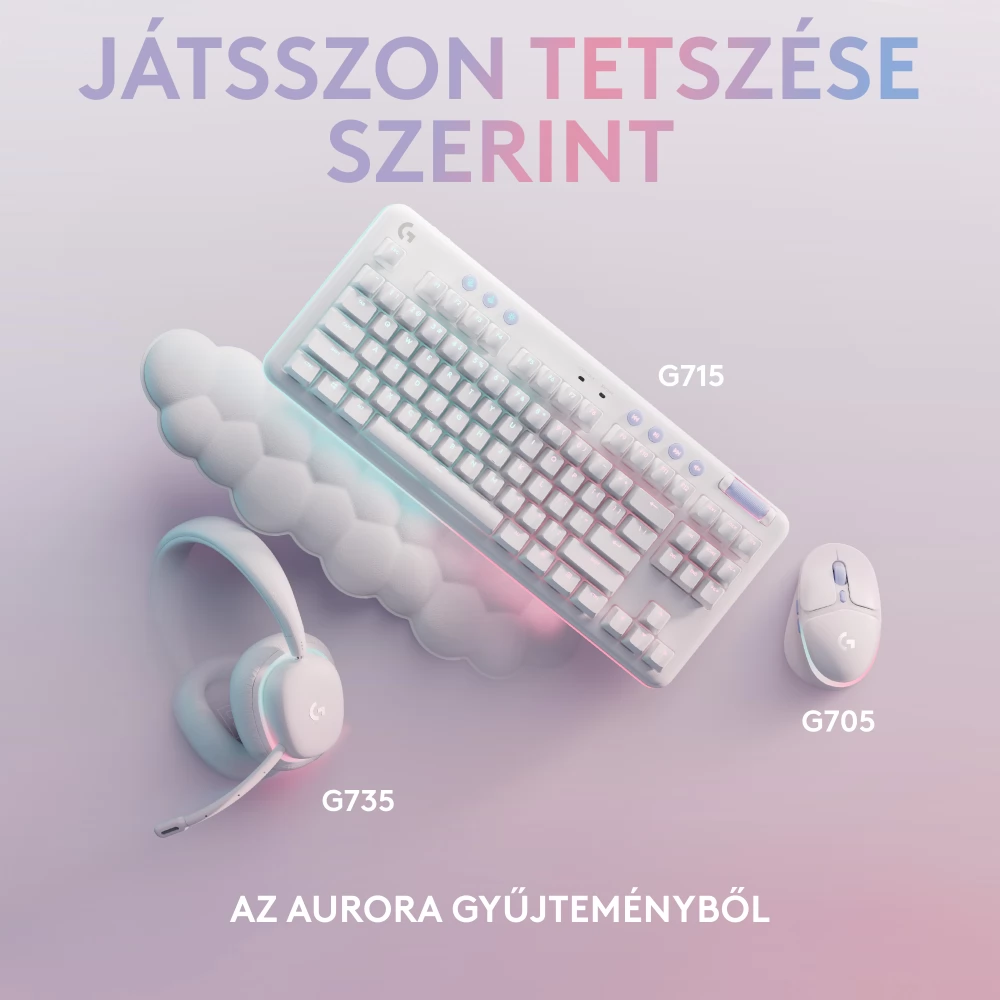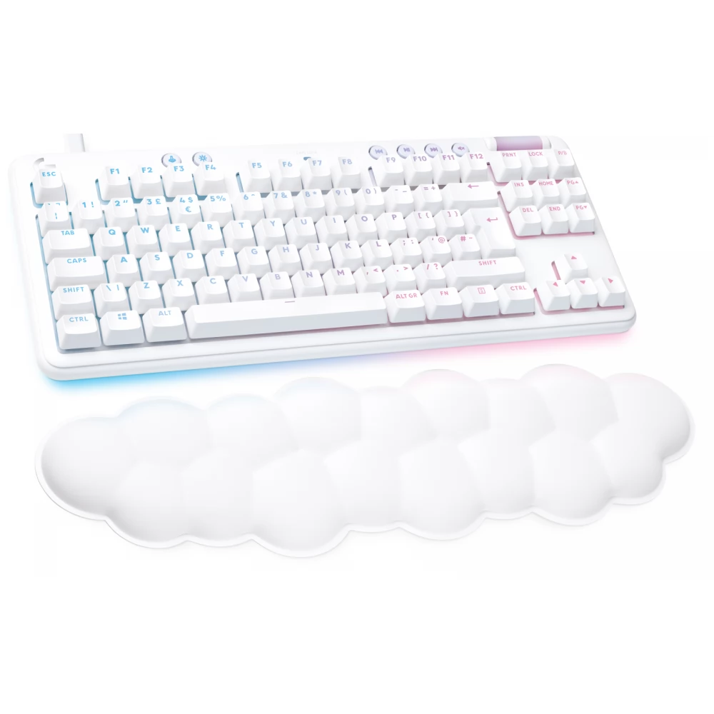 The G713, part of the Aurora collection, is a small-sized, wired, mechanical keyboard without numeric keys, which is designed for comfort with the included cloud-soft palm rest. It is also equipped with airy light RGB lighting and mechanical GX switches according to the customer's choice. Available in fog white. Color accessories are sold separately.