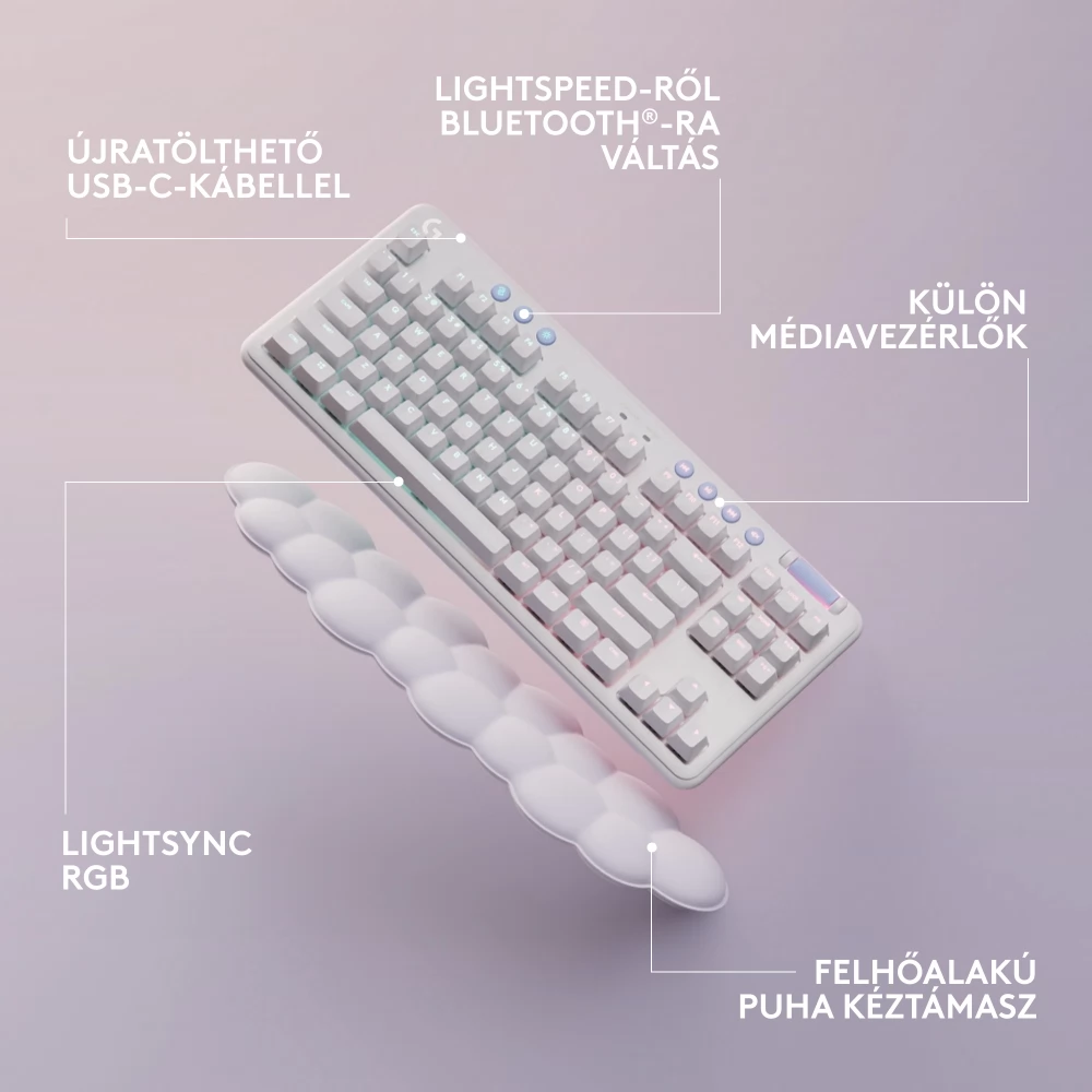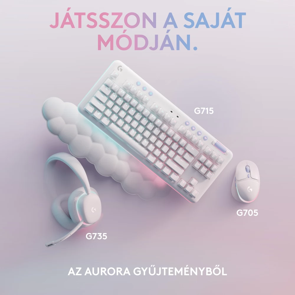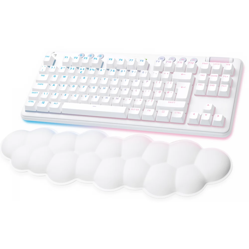 The G715, part of the Aurora collection, is a mechanical keyboard that uses LIGHTSPEED and Bluetooth® wireless technology, which is also suitable for games, and is designed for comfort with the included cloud-soft palm rest. It is also equipped with airy light RGB lighting and mechanical GX switches according to the customer's choice. Available in fog white. Color accessories are sold separately.