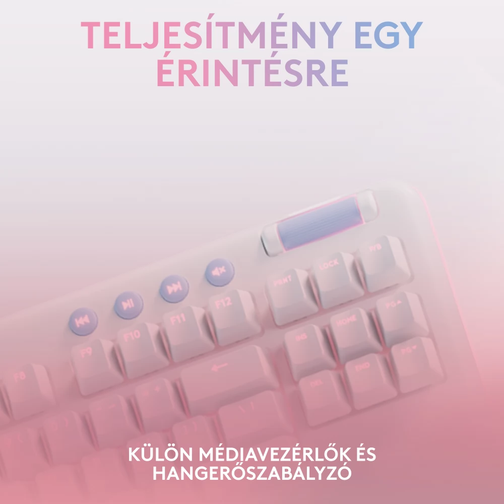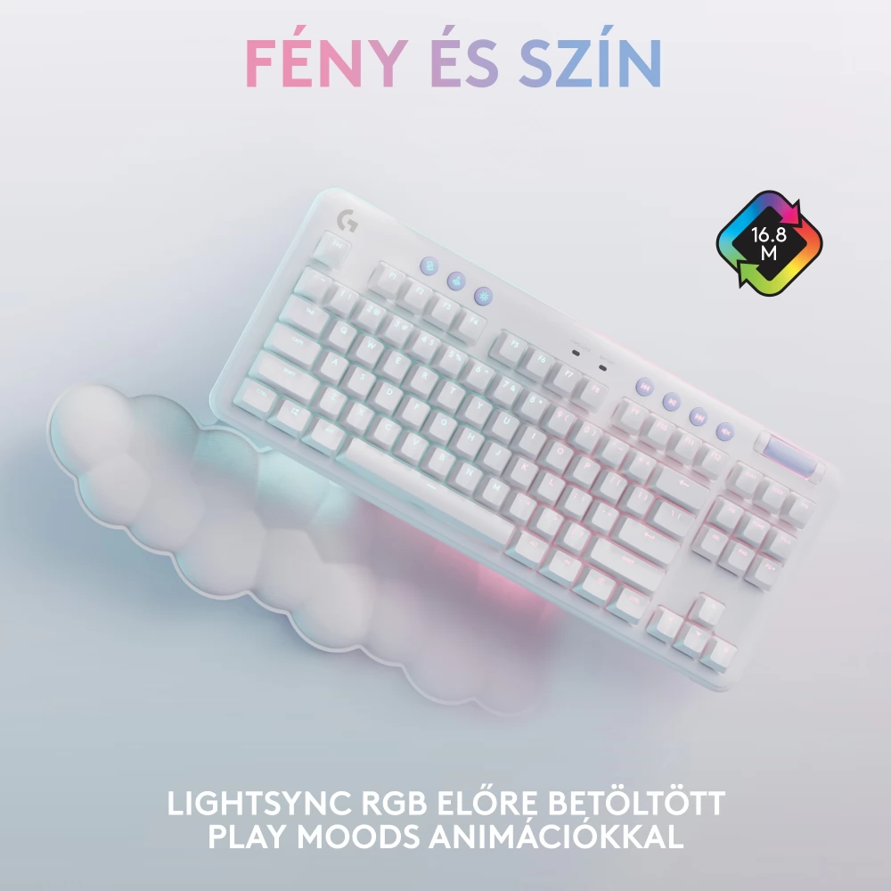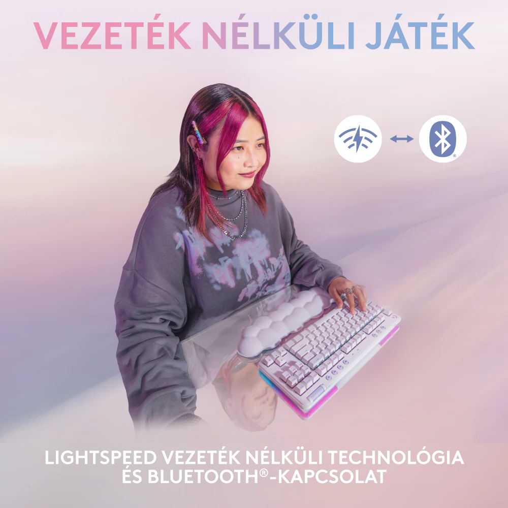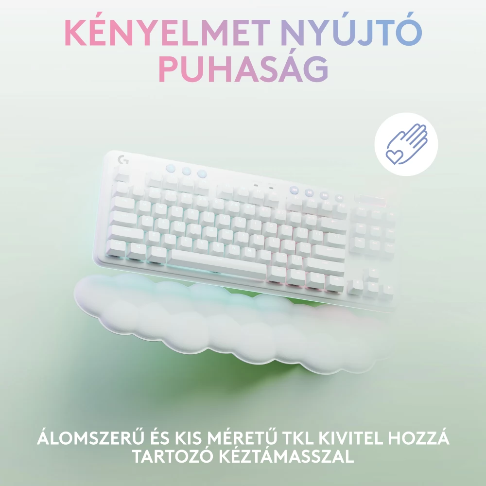 The G715, part of the Aurora collection, is a mechanical keyboard that uses LIGHTSPEED and Bluetooth® wireless technology, which is also suitable for games, and is designed for comfort with the included cloud-soft palm rest. It is also equipped with airy light RGB lighting and mechanical GX switches according to the customer's choice. Available in fog white. Color accessories are sold separately.
