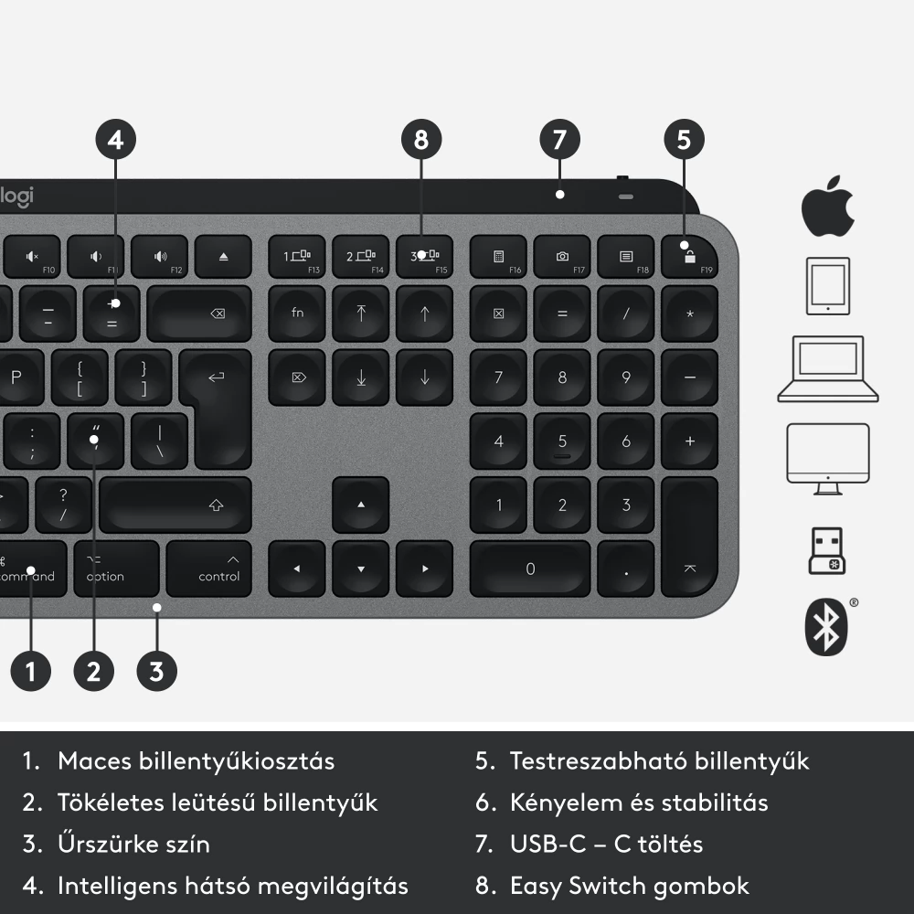 LOGITECH MX Keys cable without keyboard Machez Bluetooth többeszközös MacOS and iOS compatible Nemzetközi allocation Astro grey