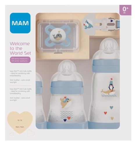 In this perfect little boy's gift, you will find everything a newborn baby needs. It also contains dummy bottles of different sizes, pacifiers, dummy sterilizers and a pacifier ribbon. All this is very nice in pale blue. All MAM products are made of BPA and BPS -free material.