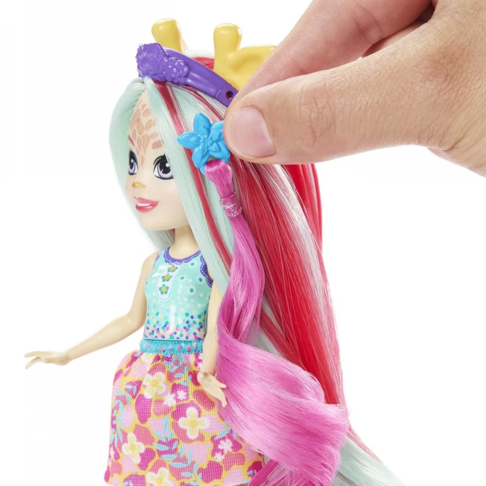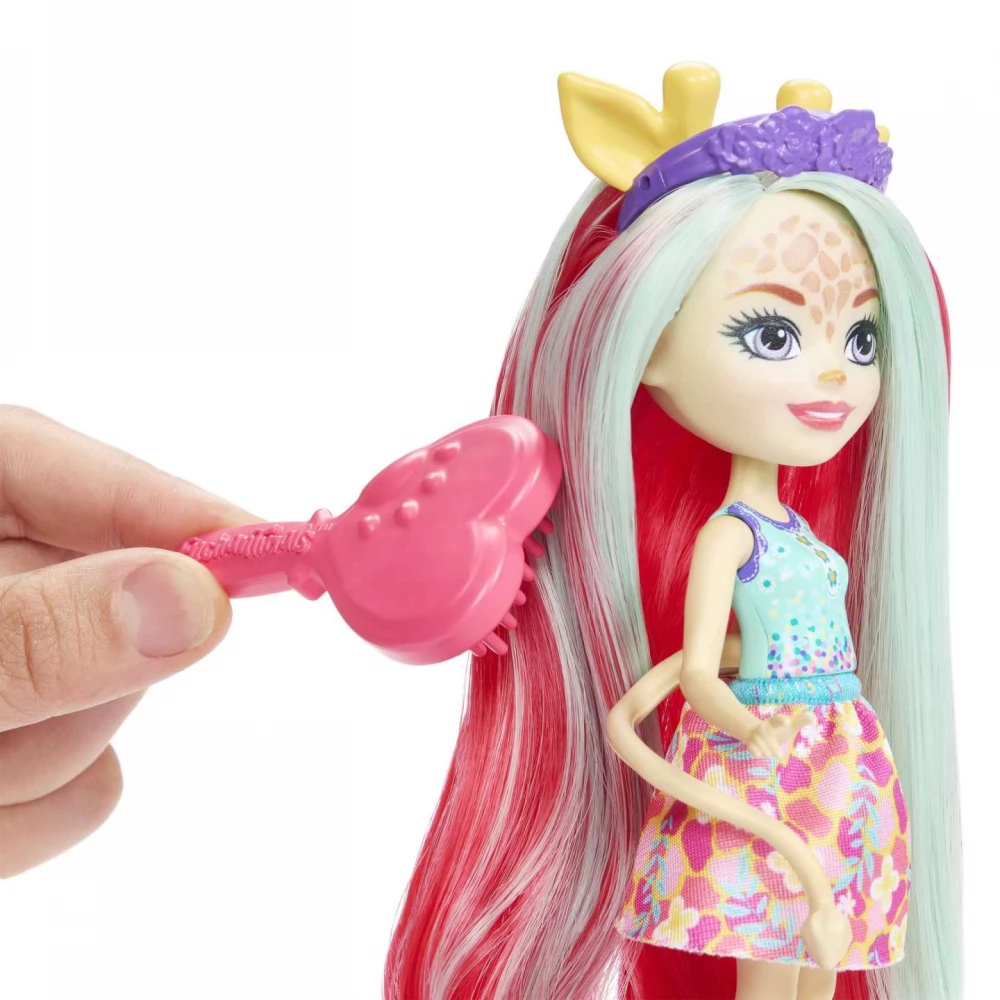 The elegant Enchantimals dolls are special because they look so much like their animal friends. The set includes an elegant 15 cm giraffe doll, Gillian, a giraffe figurine Pawl and several accessories (spare lock, comb, hair clip, hair band).
