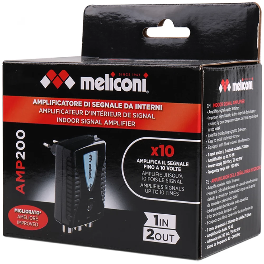 The Meliconi AMP 200 digital antenna amplifier is suitable for amplifying a digital broadcast TV signal with up to 10-fold amplification. Improves picture and sound quality. It is easy to install and can be used immediately. It has one input and two amplified outputs.