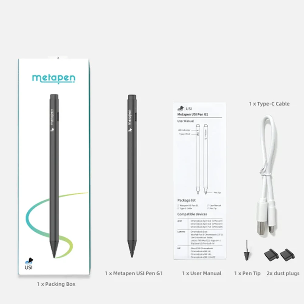 The Metapen USI Stylus Pen G1 is a digital pen designed for Chromebooks with 4096 levels of pressure sensitivity and USB-C fast charging. The device uses the Universal Stylus Initiative (USI) protocol, making it widely compatible with touchscreen Chromebooks from Lenovo, HP, Acer, ASUS and Samsung.