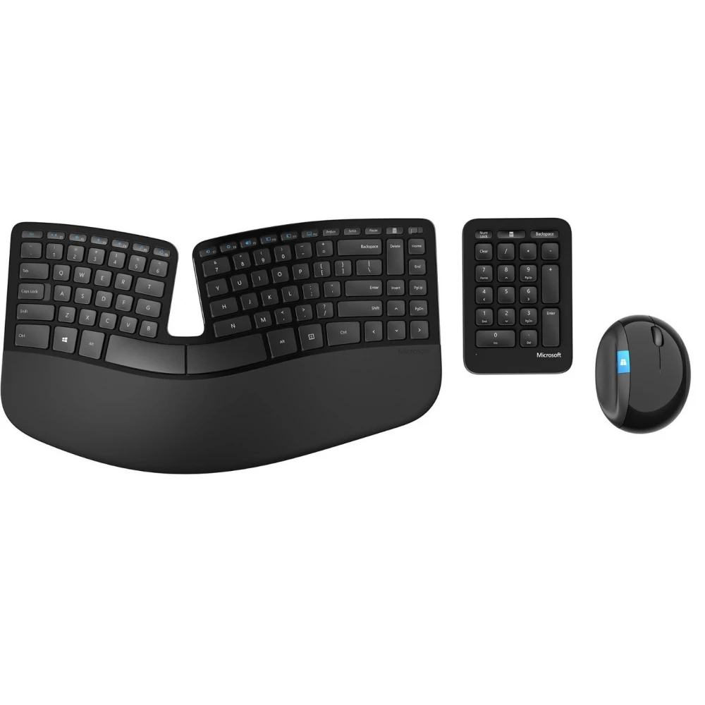 Sculpt Ergonomic Desktop is based on modern ergonomic principles. Its split keyboard layout keeps the wrist and forearm in a relaxed position, and its padded palm rest elevates the wrist. Due to the raised middle part of the keyboard, the eversion of the wrist, which can cause pain and reduce the ability to move, is reduced and corrected.