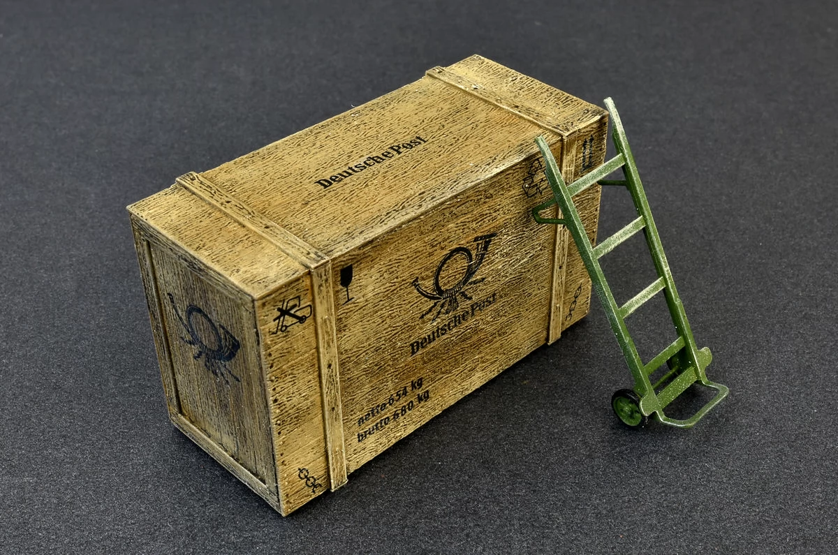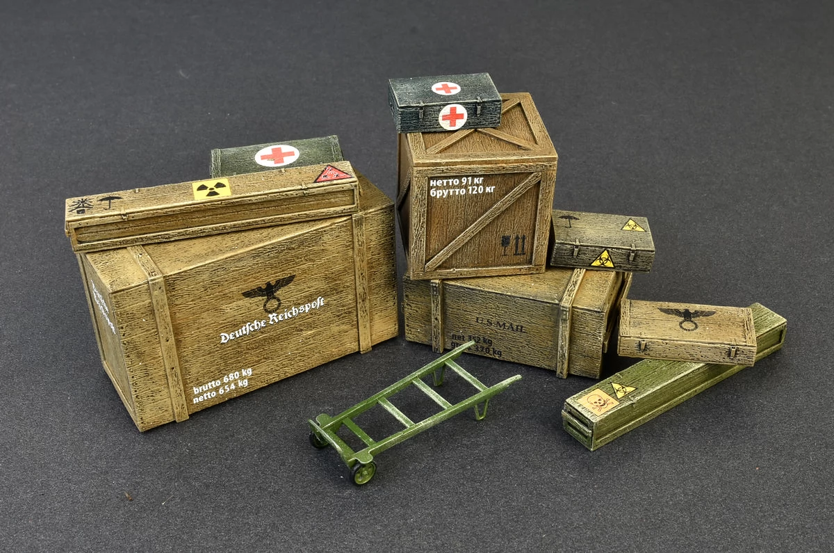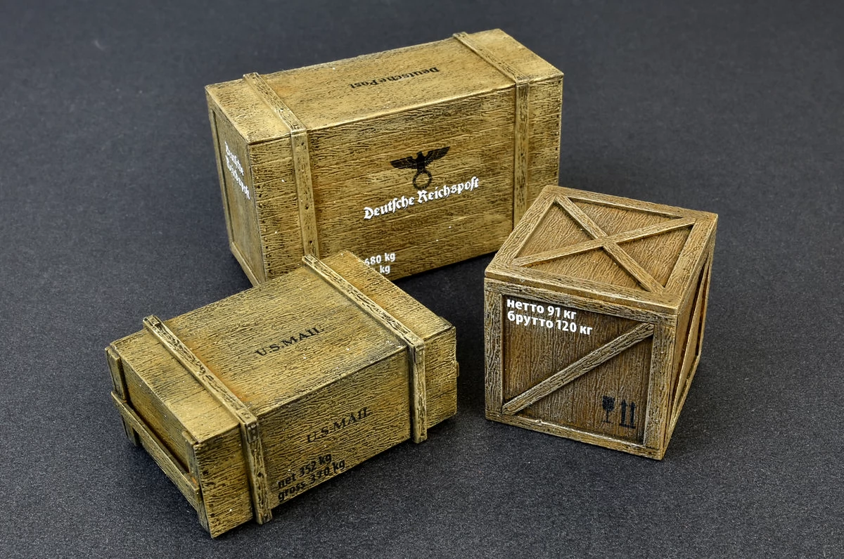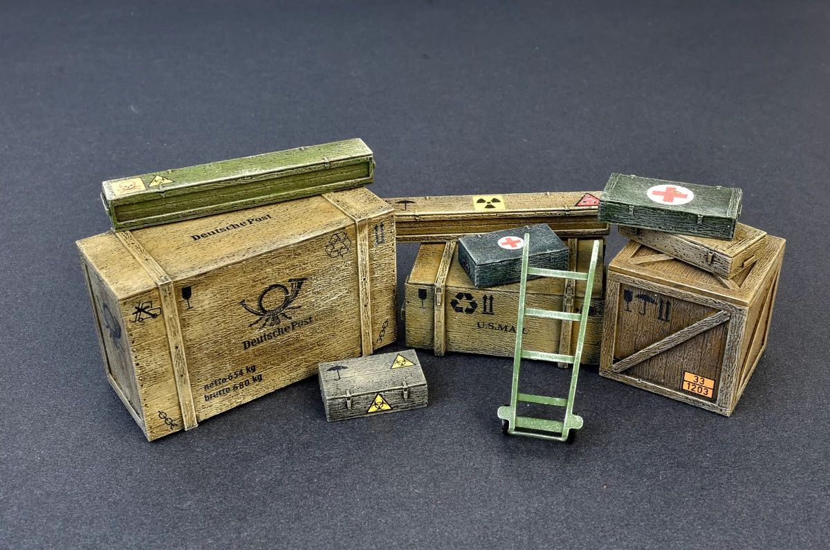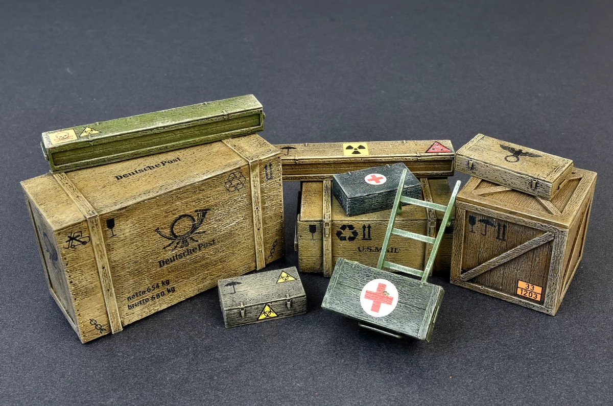 1/35 scale box and crate set for models, making diorama. It requires painting and gluing. Multiple sticker options.