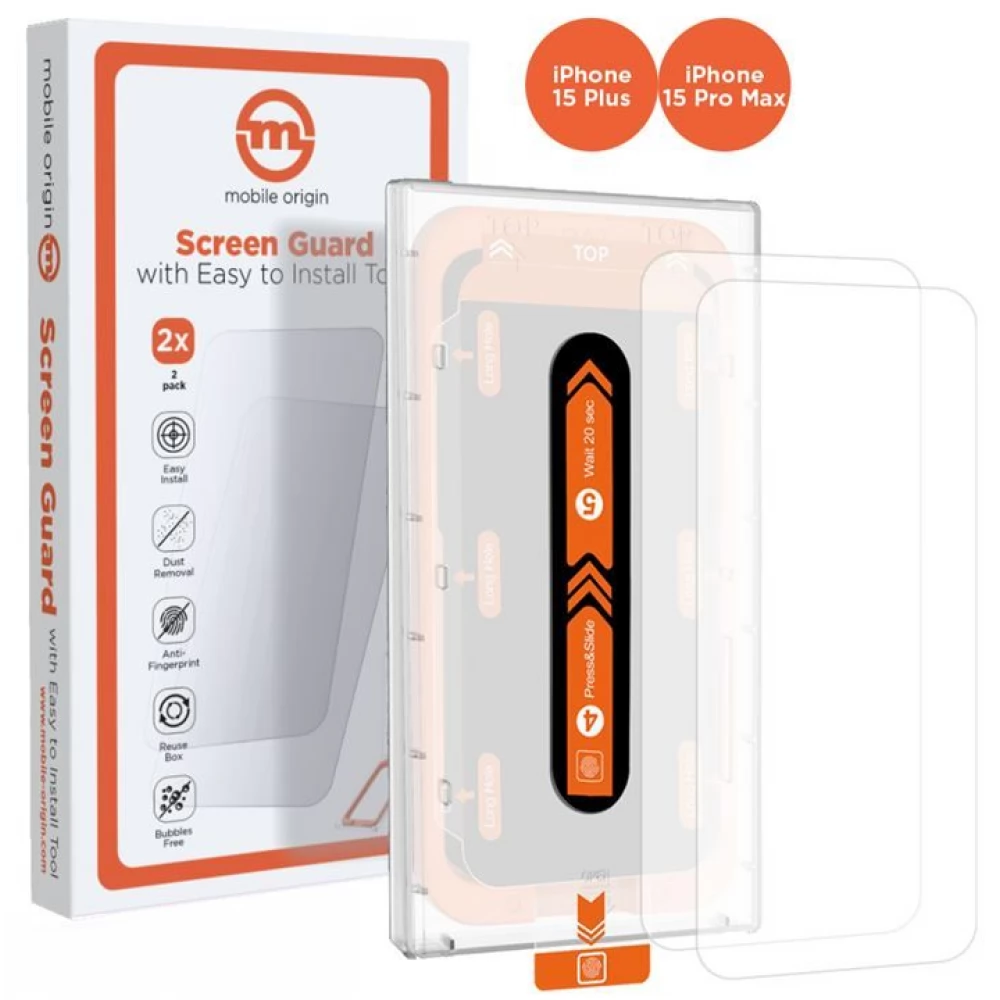 MOBILE ORIGIN Orange Screen Guard with easy applicator iPhone 15 Pro Max/15 Plus 2 pieces set