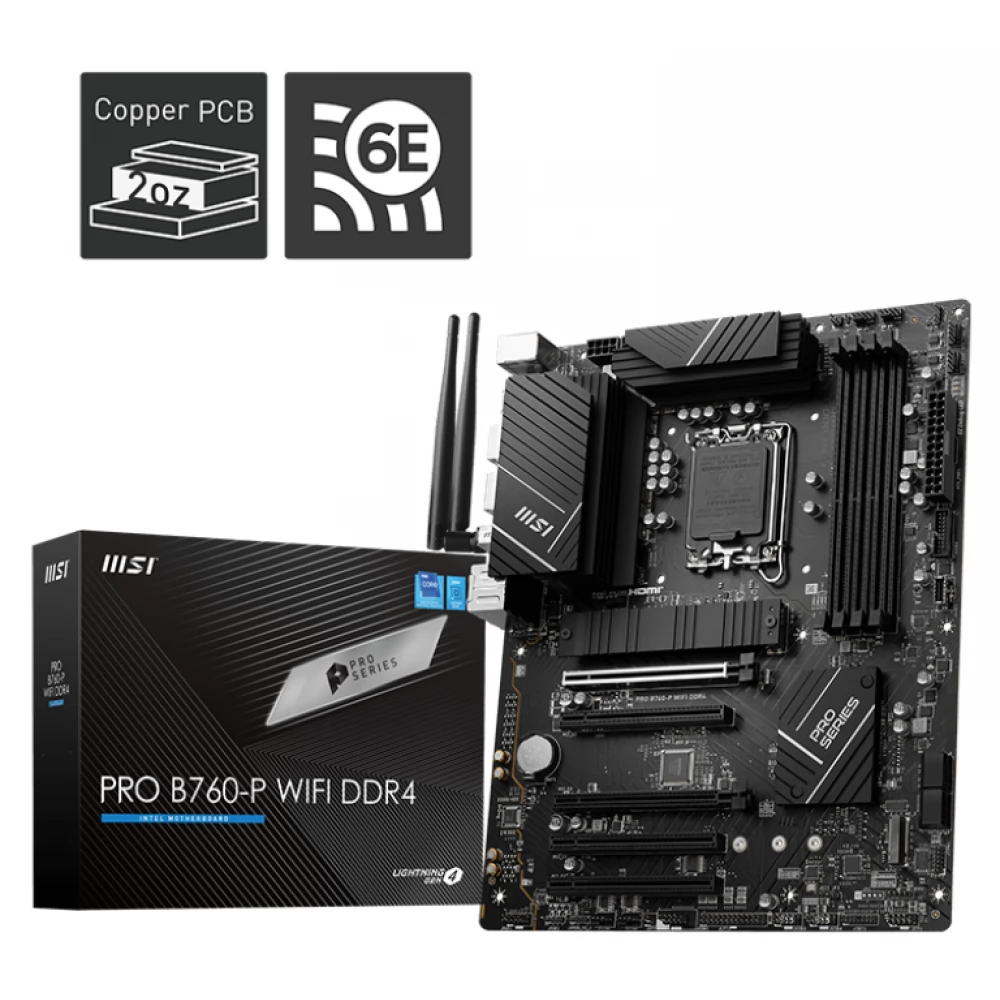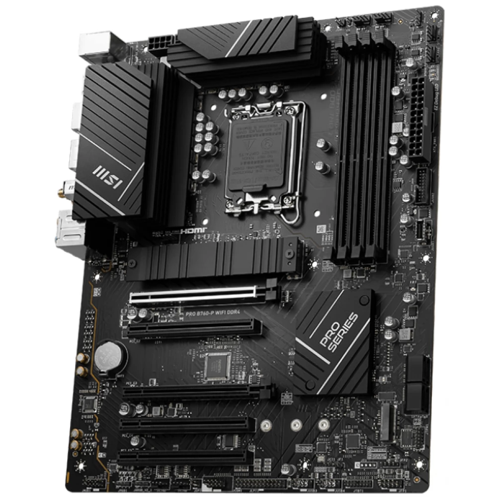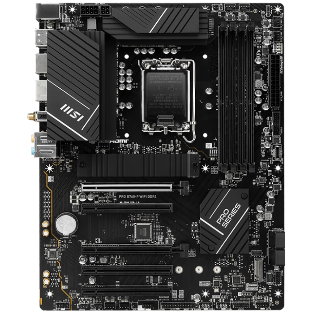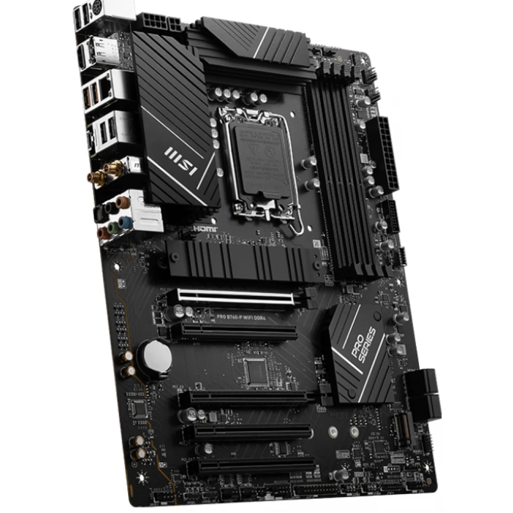 MSI PRO B760-P WIFI DDR4 motherboard with LGA-1700 socket, Intel B760 chipset, video card integrated in the processor, 4 DDR4 memory slots (max 128GB). 8 USB 2.0 ports, 3 USB 3.0 ports, 3 USB 3.1 ports.