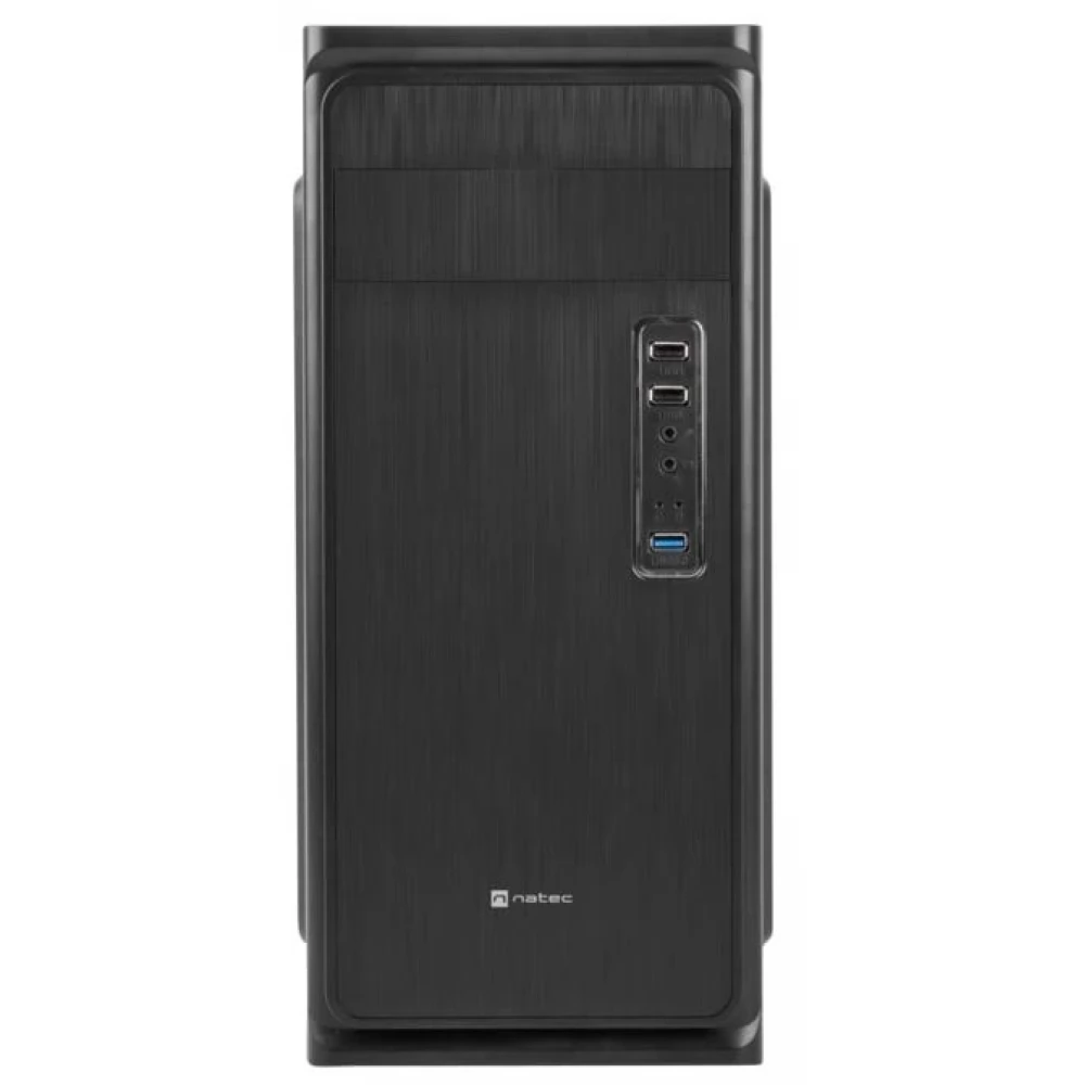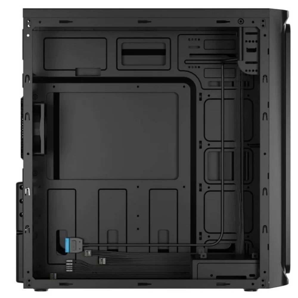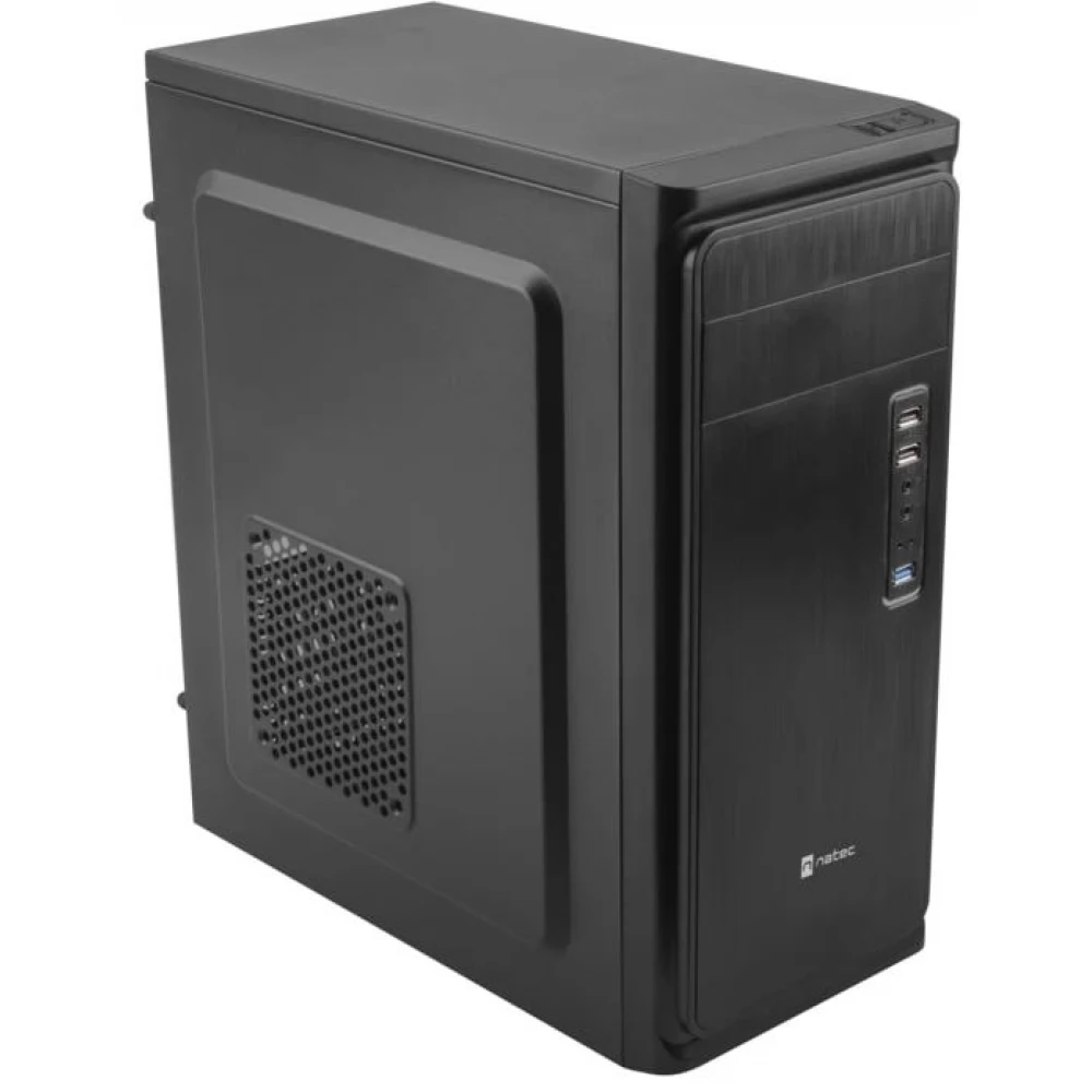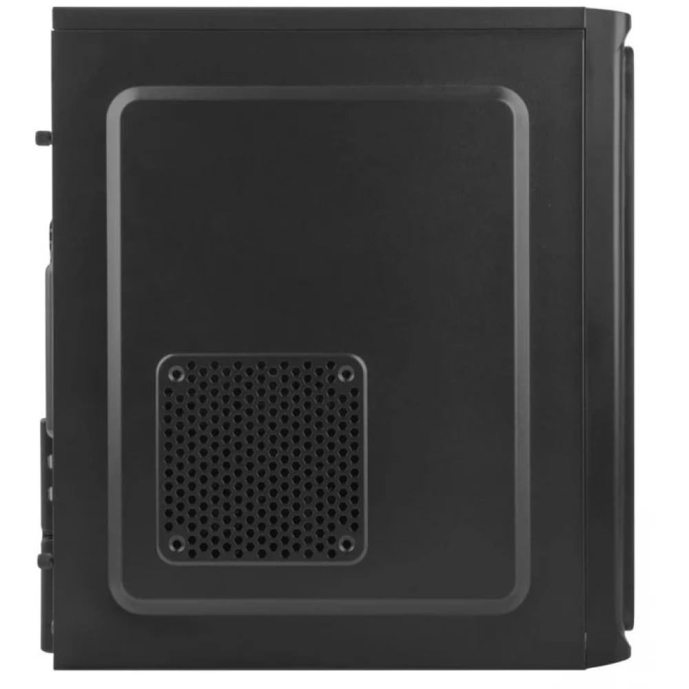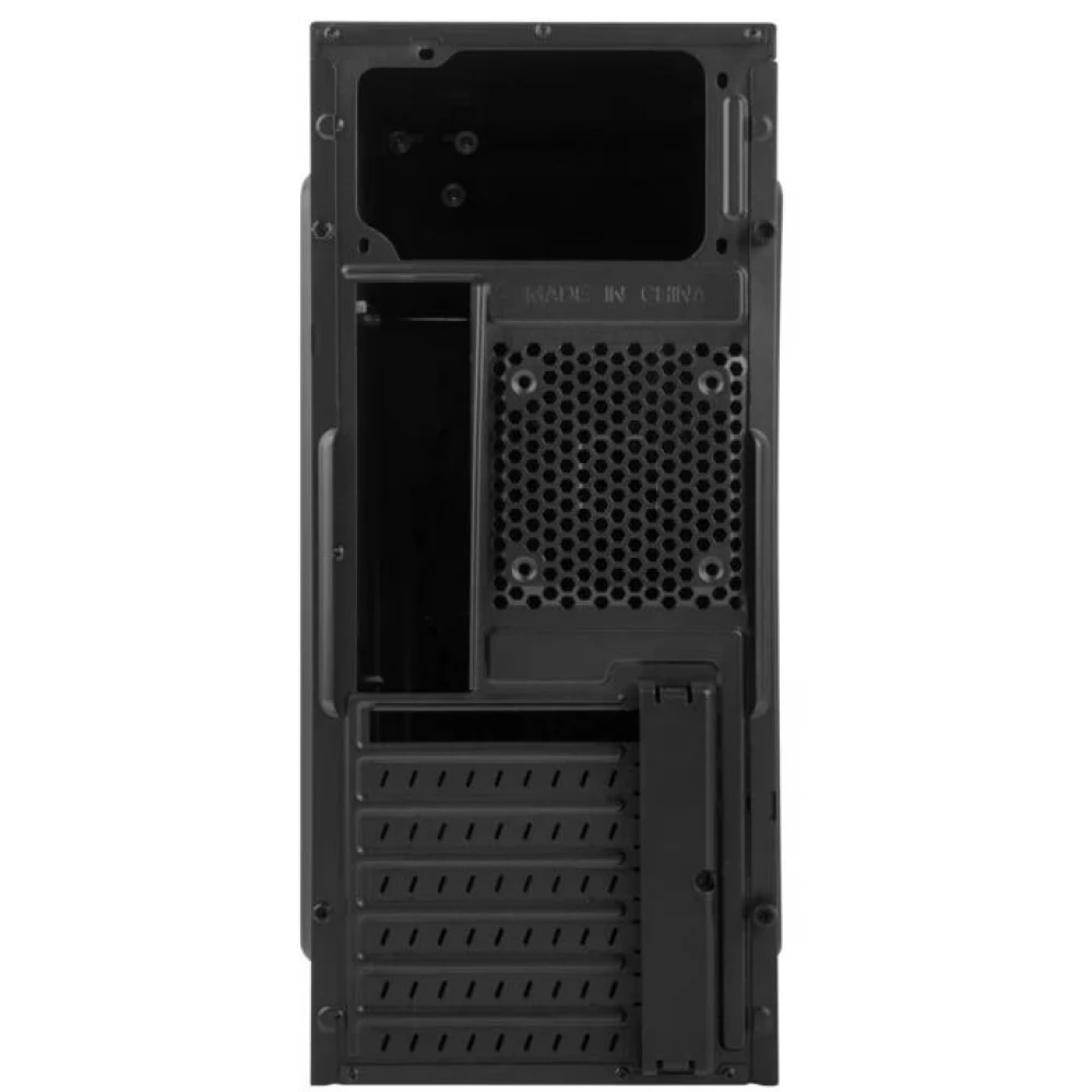 Black computer case without power supply, built with simple, clean shapes, with 1 built-in 8 cm fan.