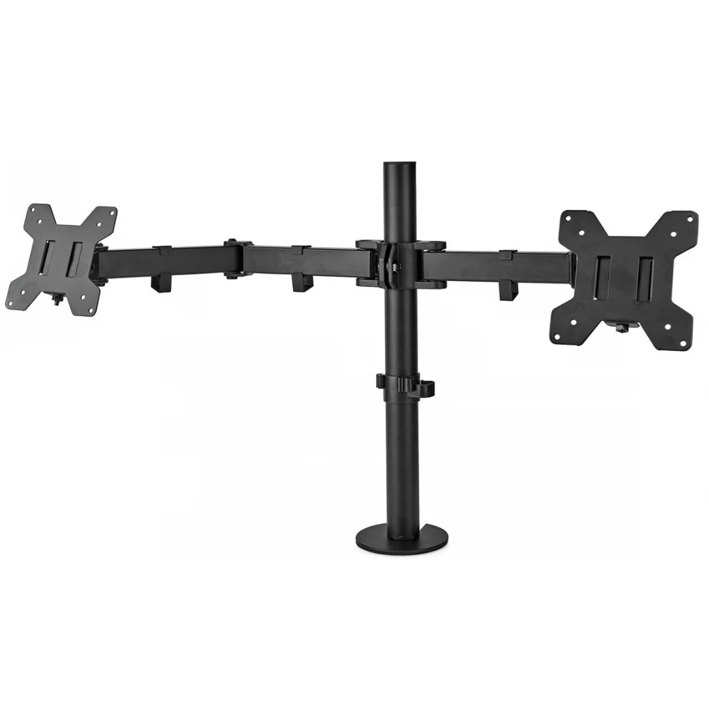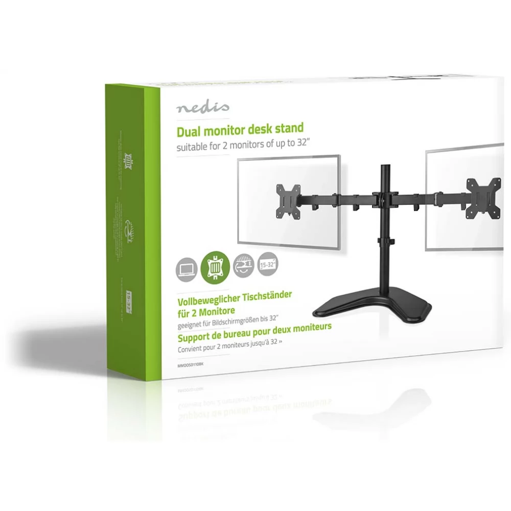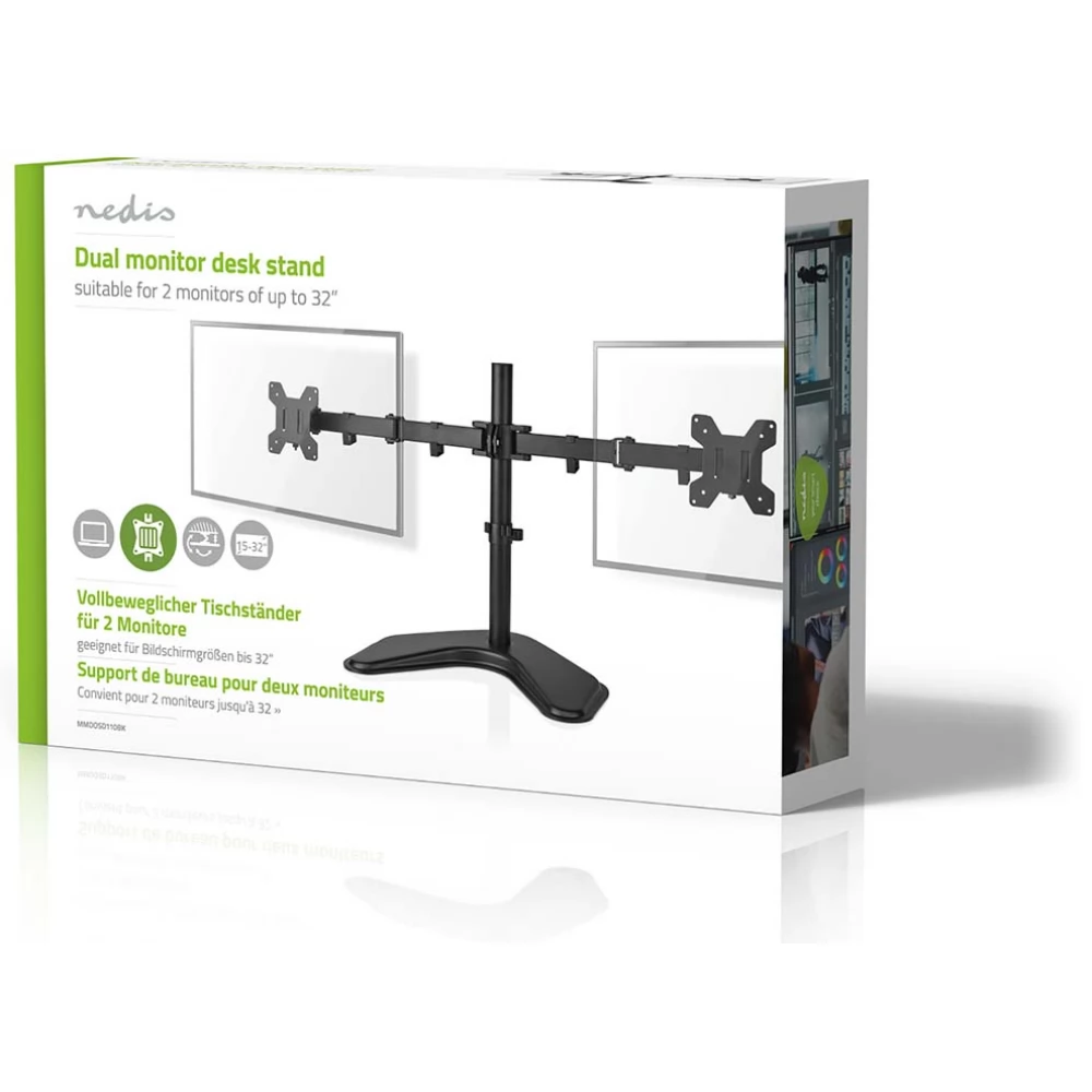 The Nedis Fully Adjustable Monitor Desk Bracket is a tilt, tilt and swivel desk bracket for 2 flat screens up to 32". This mount is a great choice for space-saving placement on desks using a desk stand.