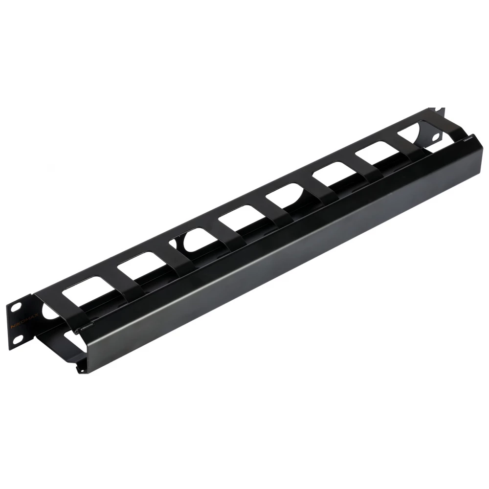 1U high NIKOMAX cable management panel for mounting in a rack cabinet, equipped with 53 mm cable management metal rings and a cover panel.