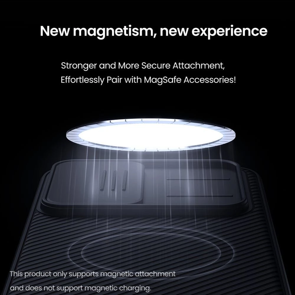 The NILLKIN CamShield Pro Magnetic case, with its solid plastic design, provides reliable protection against everyday bumps and scratches. It has a built-in camera cover that can be easily moved to protect the lens from damage and prying eyes. The magnetic feature allows for use with MagSafe compatible accessories such as a car mount or wireless charger. The finely ribbed, striped surface of the back panel not only gives an elegant appearance, but also provides a secure grip. This case is an ideal choice for those who value both style and practicality.