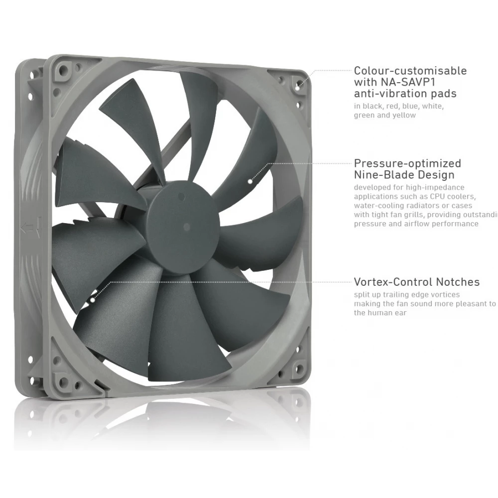 140 mm quiet house cooler fan with PWM speed control and up to 1500 RPM speed. The S mark refers to the square frame design.