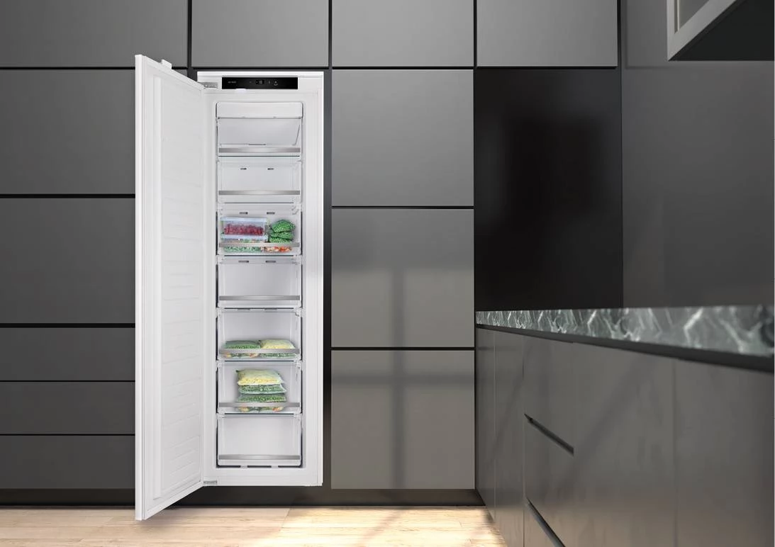 Built-in freezer cabinet with no-frost technology, 178 cm high, 200 liter freezer, electronic temperature, 7 freezer drawers, consumption: 231 kWh/year, freezer capacity: 9 kg/24 hours, noise level: 41 pcs (A), reversible door opening