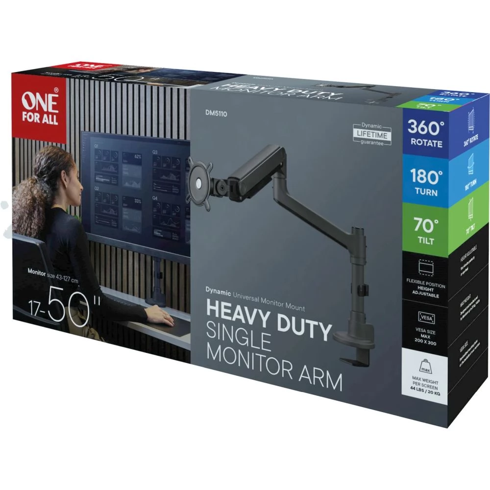 Designed specifically for large and heavy screens, the One For All DM 5110 Single Heavy Duty universal monitor arm lends the workspace a modern aesthetic. It provides a secure and stable monitor hold while maximizing desk space and creating space for other essential devices. The versatile clamp or eyelet provides a perfect fit and is suitable for any tabletop up to 50mm thick. Thanks to the durable mechanical spring system, the monitor arm can be easily adjusted to any desired ergonomic position. Adjustable tension ensures smooth movement and secure positioning for monitors of any size and weight. With adjustable tension, the mount can be tightened to keep the monitor in place or loosened to allow it to move freely, providing maximum comfort in, for example, a home office. The voltage indicator enables precise settings and helps to choose the optimal position of the monitor. The integrated cable management system ensures a consistently organized work environment and hides the unsightly pile of cables. The DM 5110 universal, heavy-duty monitor arm offers the perfect blend of style and functionality, transforming any workspace into a modern, organized and efficient environment. Easy-to-follow instructions and included mounting hardware make mounting the monitor easy.
