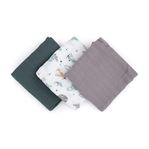 PETITE AND MARS Bamboo muszlin 3db-os diaper set 68 x 68 cm Moussy Grey Planes