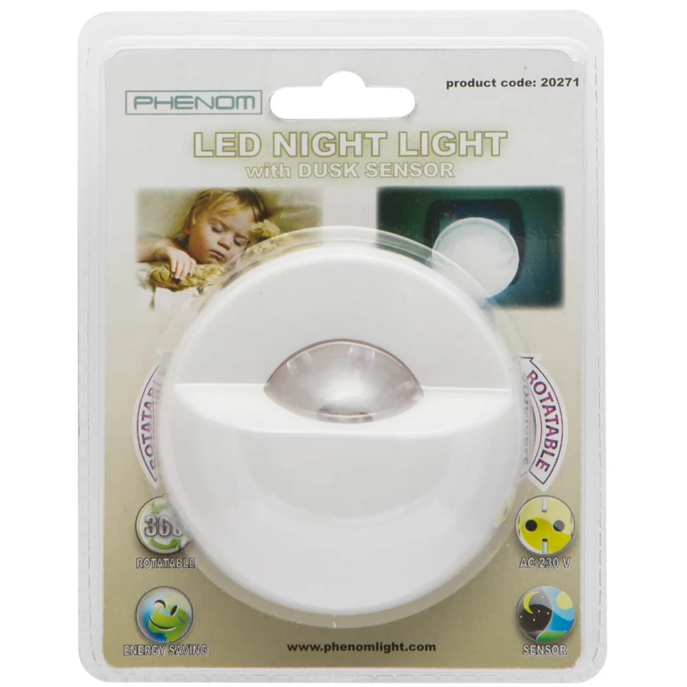 When it gets dark, the light sensor turns it on automatically, then switches it off when there is enough light. The high-quality Phenom LED night light, with its decorative appearance, is a practical addition to any room in your home. Designed for indoor use only, the rotating head directional light provides discreet illumination.