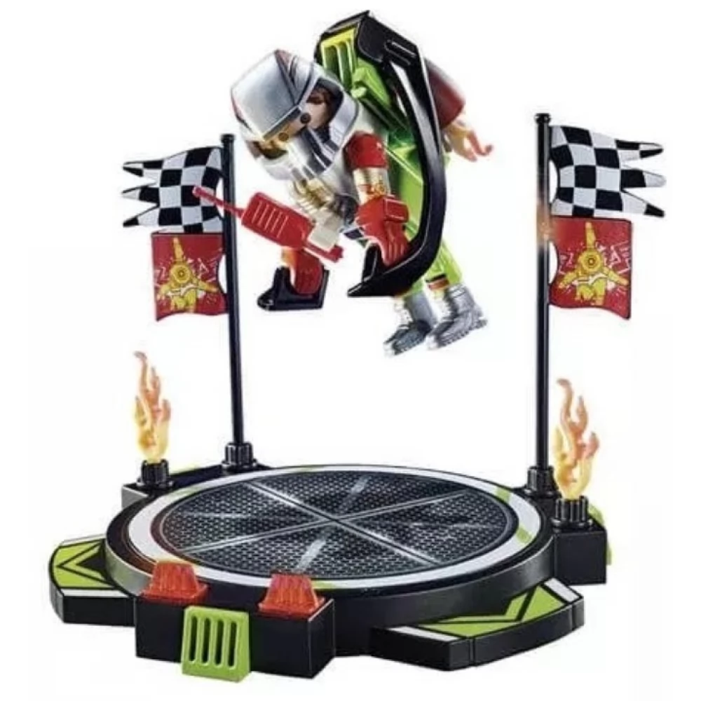 The Playmobil Air Stuntshow Jetpack set is guaranteed to make the hearts of all fans of stunt actions skip a beat. Only a true stuntman has the courage to take to the skies with a jetpack! The showman stands on the platform that helps take off and land safely and waves to the audience. He just starts the jetpack and flames shoot out of the nozzles. It rises slowly at first, then faster and faster. The helmet and flight gear can be removed from the figure.