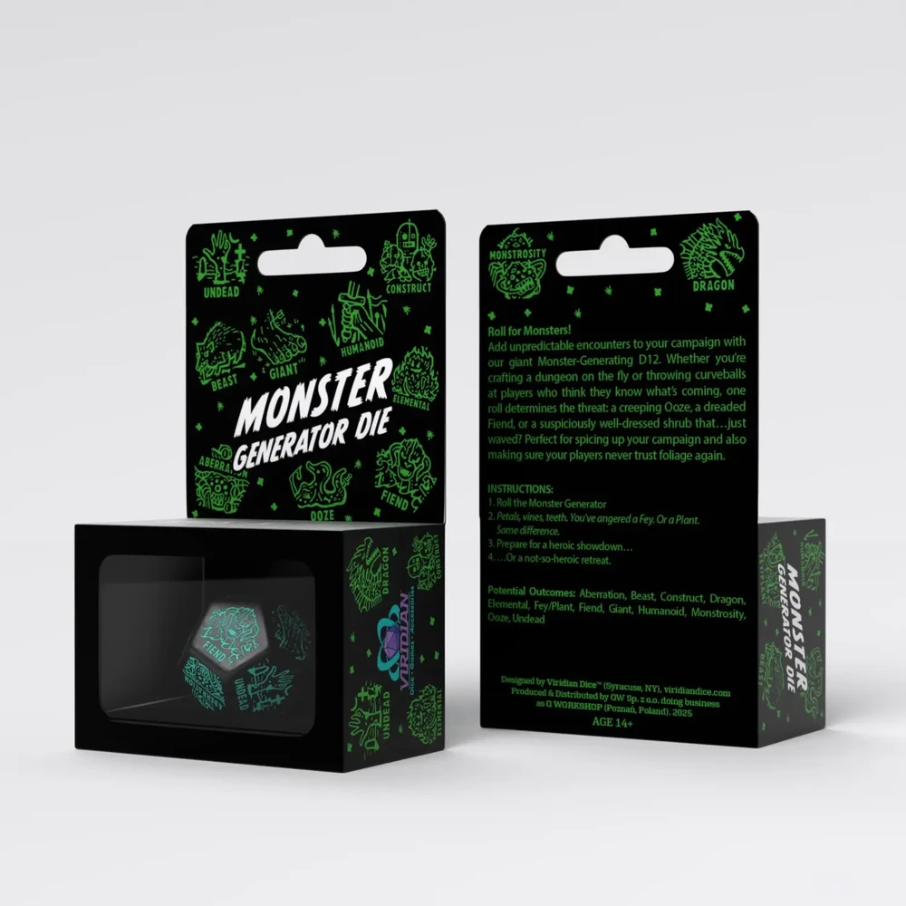 Monster-Generating D12 is a storyteller's best friend when unexpected twists, spontaneous encounters, or player-freaking twists are needed. One roll and you'll see what's lurking around the corner: an aberration, a dragon, a fiend, a giant, crawling slime spit… or a suspiciously well-dressed bush that just moved.