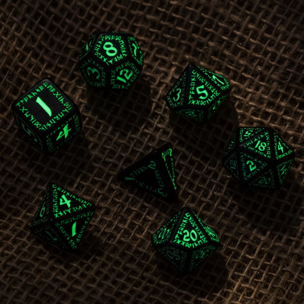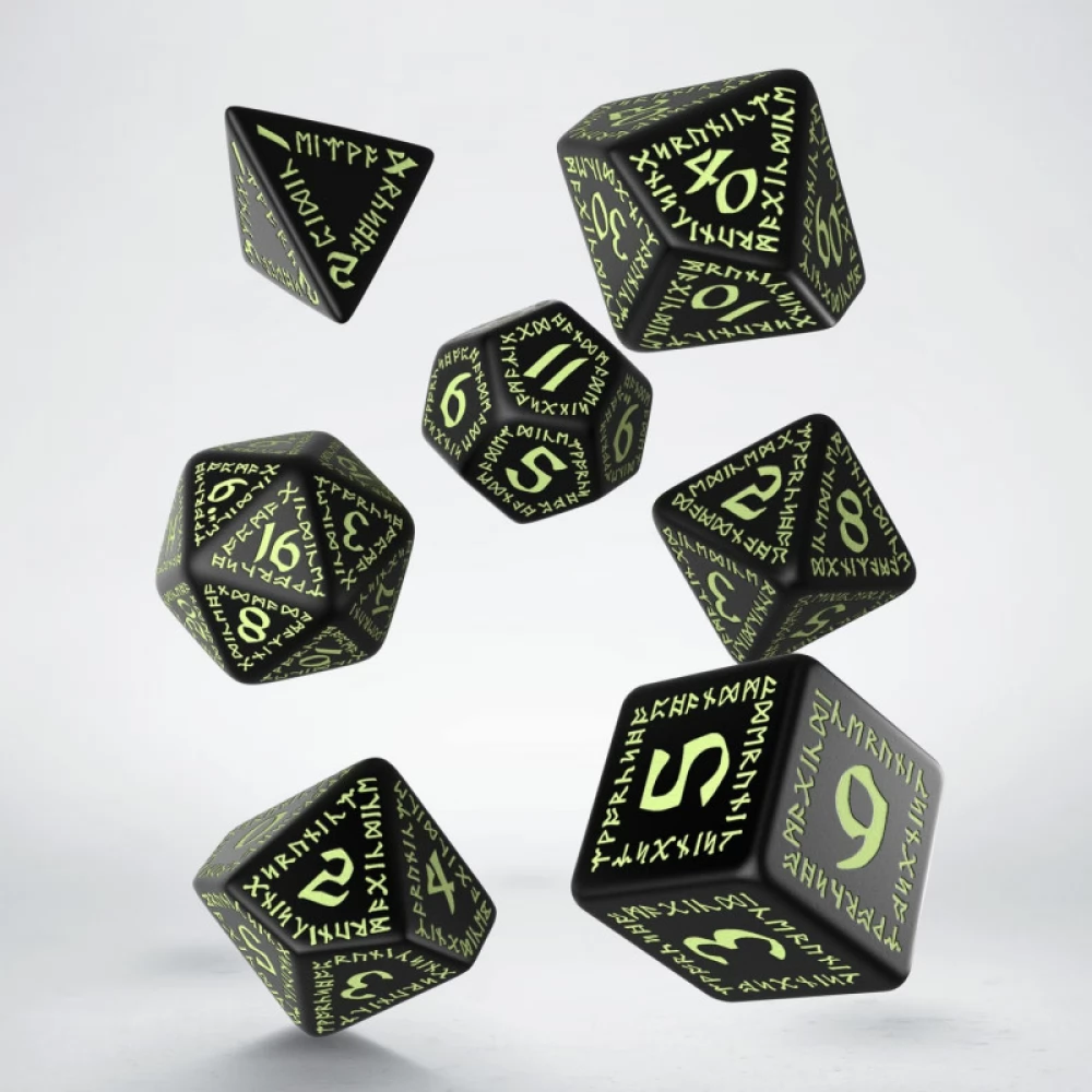 The Runic Black & Glow in the Dark Cube Set is one of the most special works of the Q workshop: the dark cubes are decorated with mystical runes that light in the dark. This set makes every throw into a magical experience, as if ancient signs were leading your hands towards fate decisions.