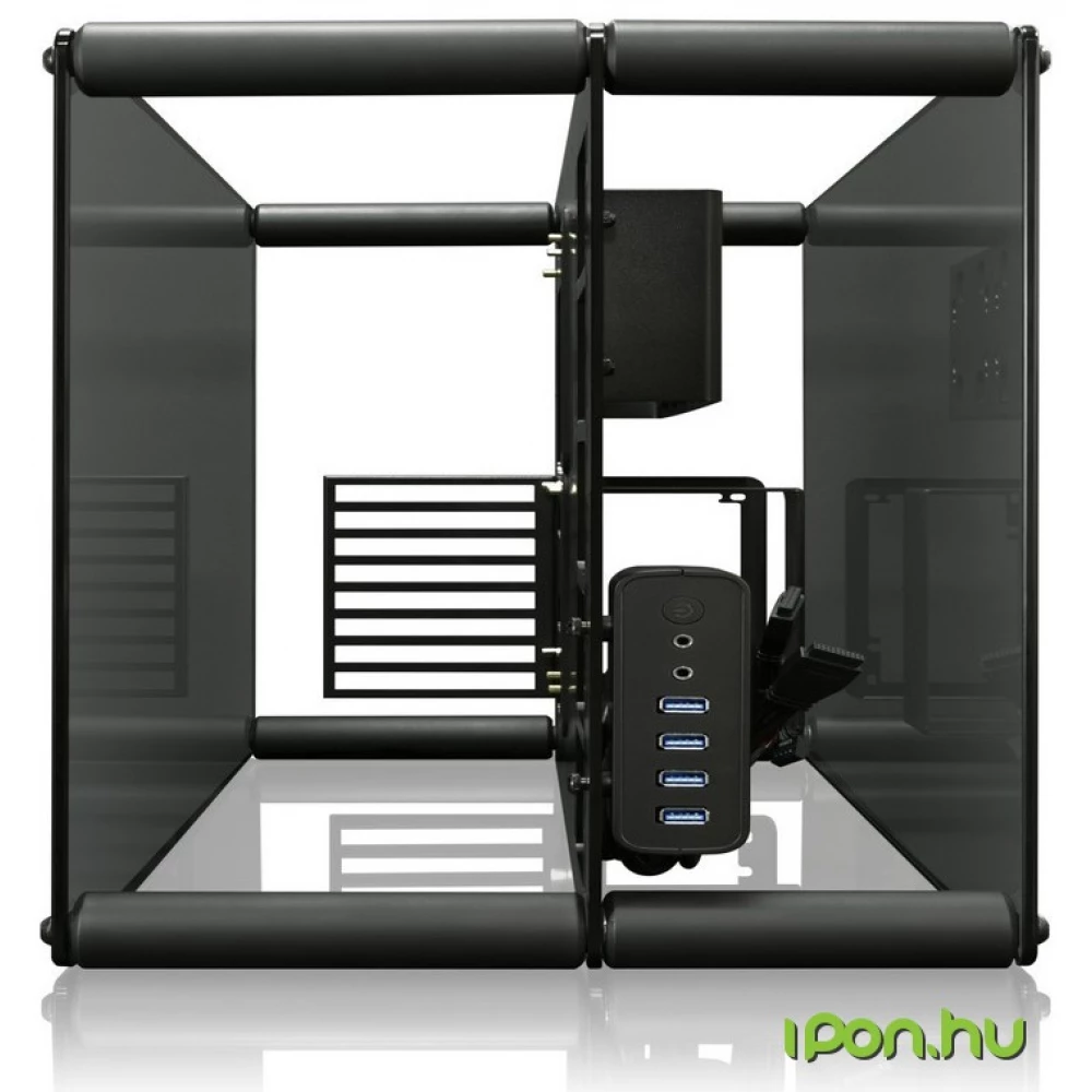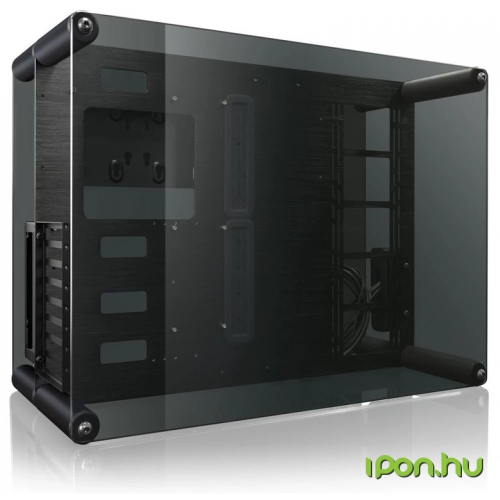 Black ATX-sized computer case with tempered glass side panel, vibration-reducing rubber on the HDD.