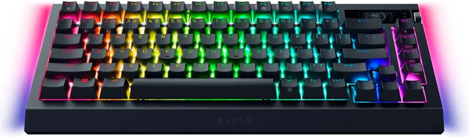 The RAZER BlackWidow V4 Pro 75% Orange Tactile US English Black Keyboard features true 4KHz wireless connectivity with Razer HyperSpeed and HyperPolling support. Equipped with Bluetooth, the Razer Command Dial, and an OLED display for monitoring PC metrics, displaying custom GIFs, and more, the interchangeable design, Razer™ mechanical switches, and key-controllable lighting provide total immersion.