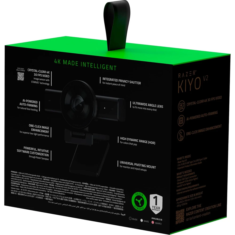 The Razer Kiyo V2 makes it easy to create professional-quality content - with a 4K 30FPS streaming webcam that automatically delivers stunning quality. Stay perfectly lit and in frame with smart features while you focus on your best work with intuitive software that makes customization a breeze.