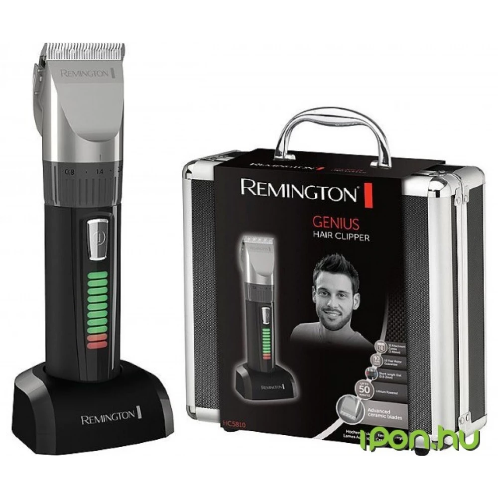 Remington HC5810 Genius hair clipper: new generation ceramic cutting edge, precision distance adjustment option, charging stand, metal carrying bag and a wide accessory set.