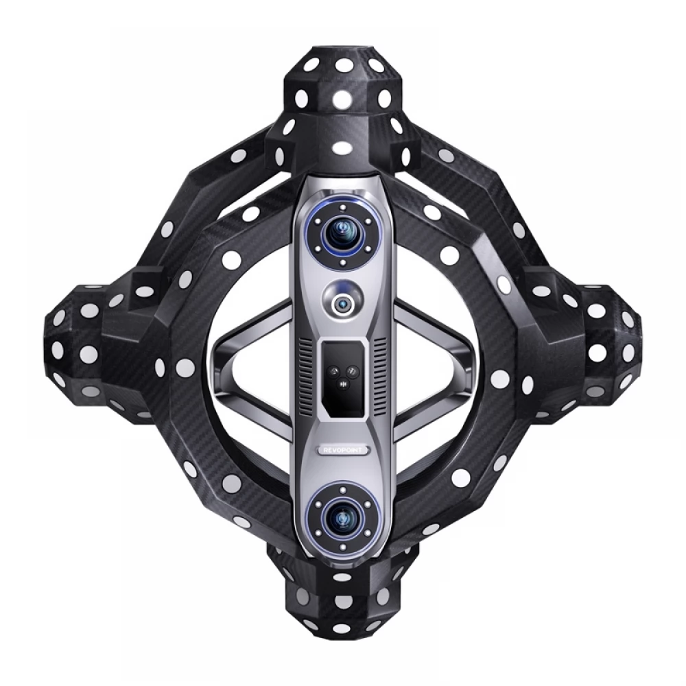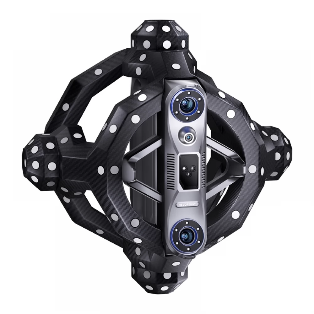 The Revopoint Trackit optical 3D scanner can be eliminated by complex settings by using two cardan shafts with automatic calibration (dual-axis gimbal system). The tracker and the scanner automatically adjust their relative position to ensure consistent geometry of the measuring system. The calibration process can be started directly in the software - the system automatically detects calibration arrays and synchronizes the camera parameters.