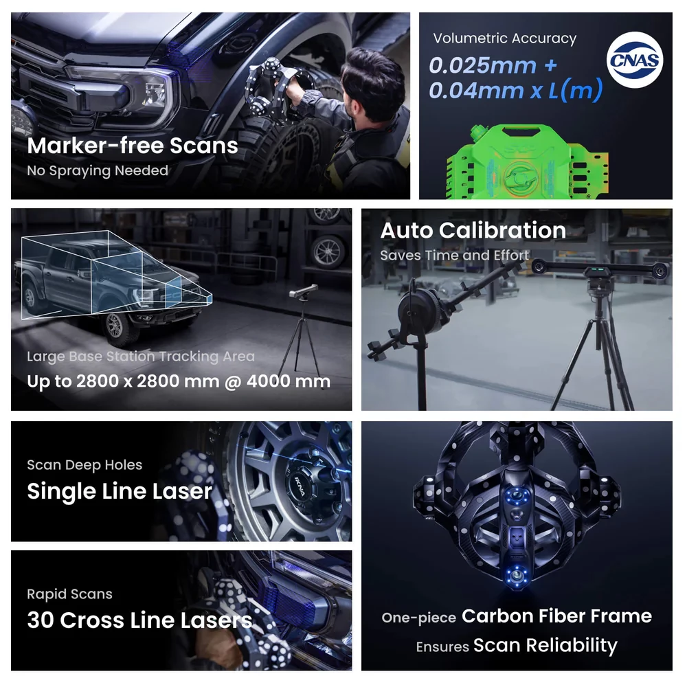 The system reaches up to 1,500,000 points per second, which allows the object to be efficiently digitized. Thanks to the intelligent tracking of the spatial movement of the scanner, you can work smoothly - without markings and without maintaining a perfectly fixed position. The Track Scan mode allows you to fix the scanner's position and angle in real -time, ensuring accurate combination of point clouds even during dynamic movements.