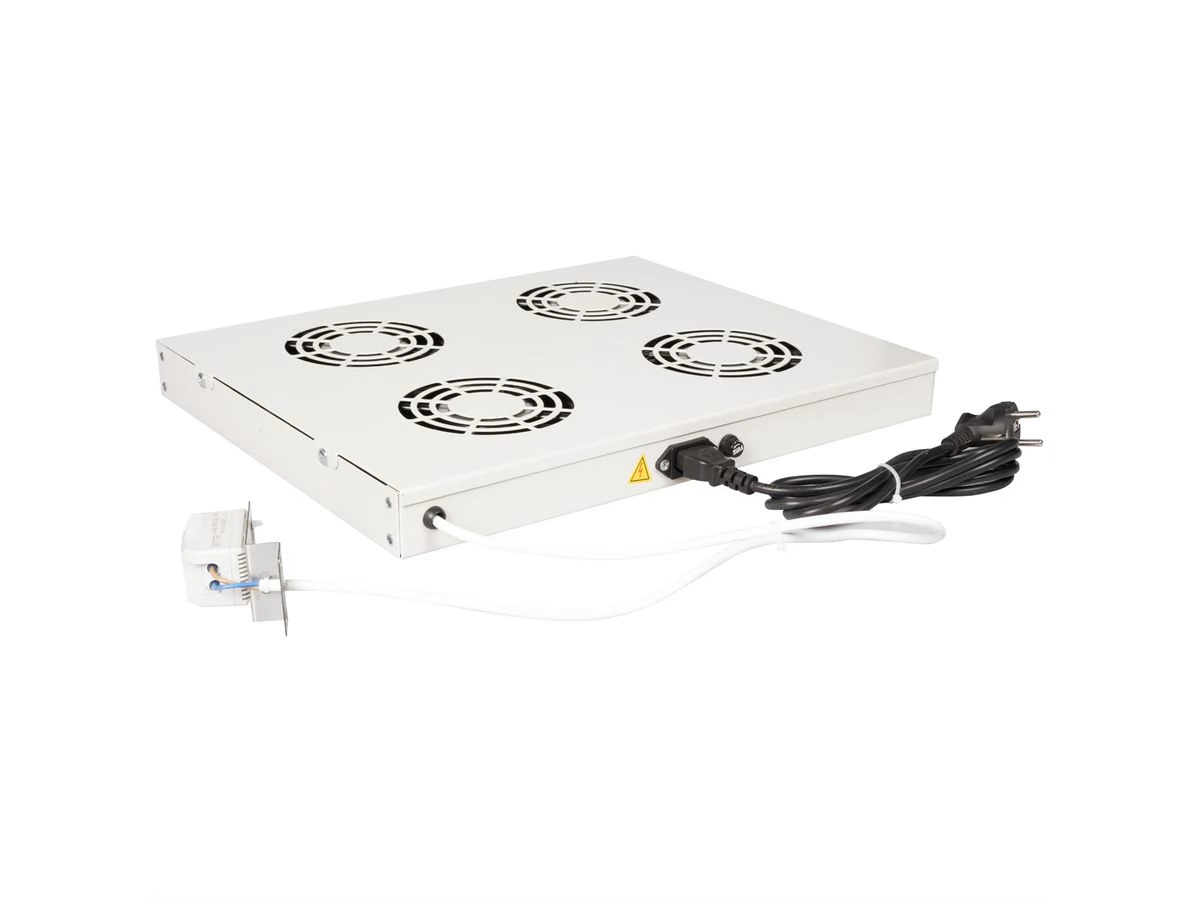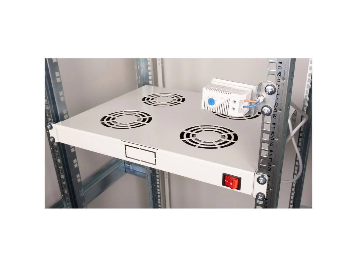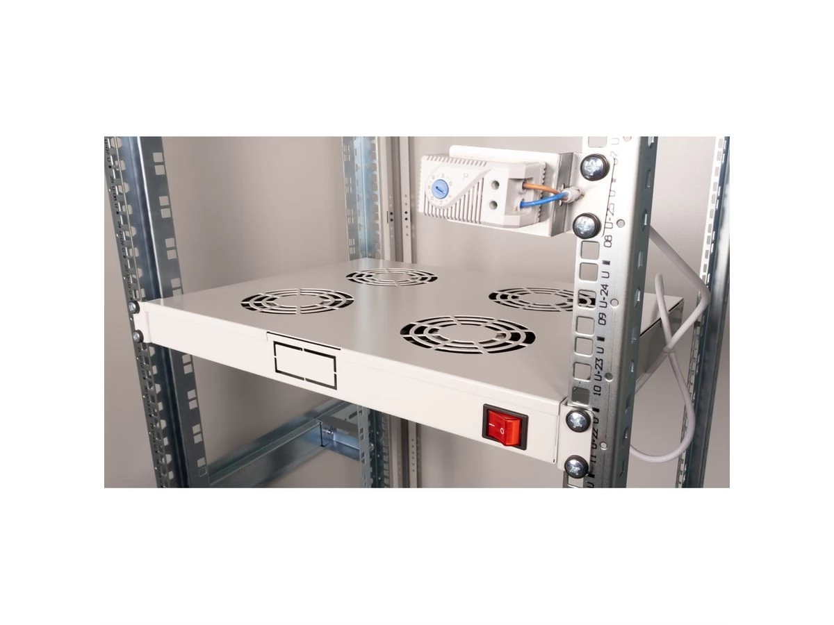 Fan units can be flexibly used in any 19 "housing. Each fan unit has two sets of mounting consoles. With the standard set, you can secure the fan unit to any height of the network or server house. The switch and adjustable thermostat offer optimal customization options. The model is available in standard gray (RAL 7035) and Black (RAL 9005).
