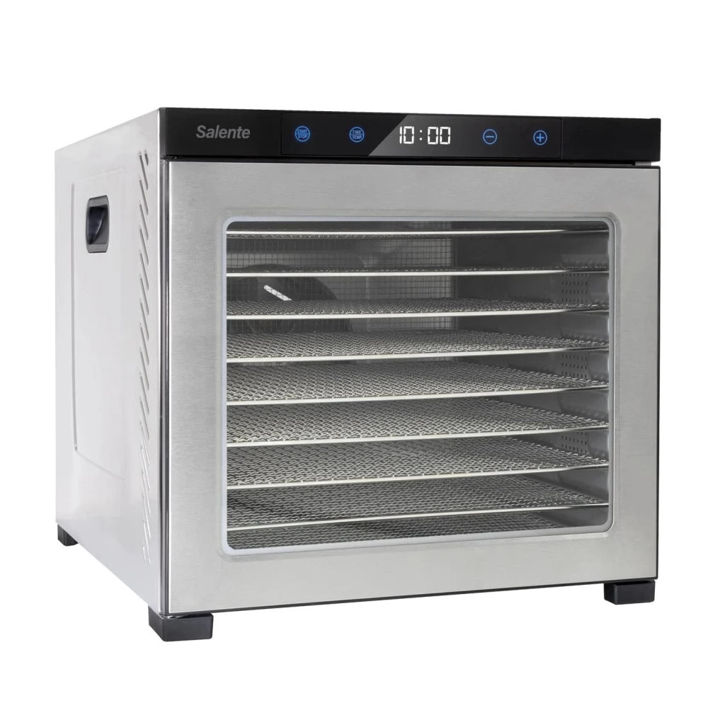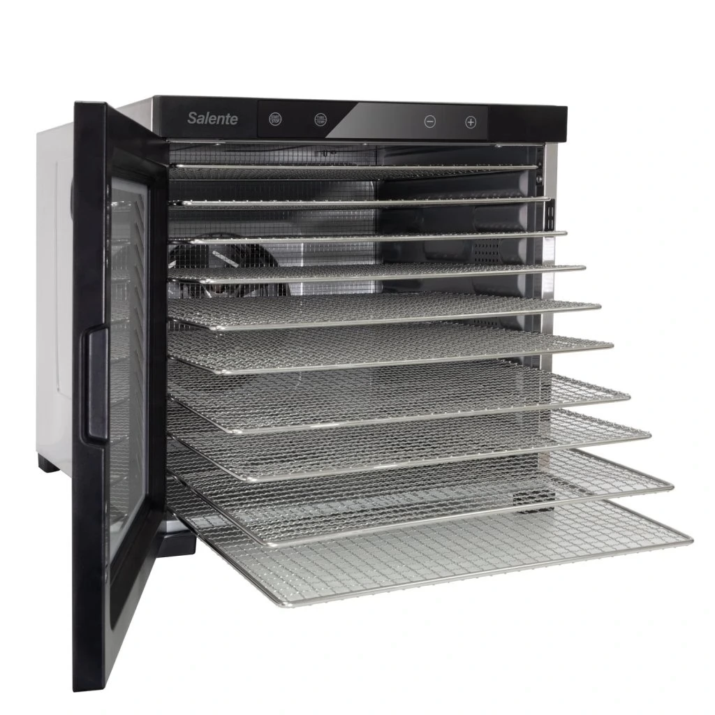 This model also has ten fine mesh drying plate for drying of finer and more sticky ingredients (eg mushrooms, herbs, bananas, tomatoes, etc.). It also has a drip tray at the bottom of the dryer that grasps the excess juice of each ingredient, making it much easier to clean the inside of the dryer stainless steel. Both the plate and the tray size are 39.4 × 39.4 cm.