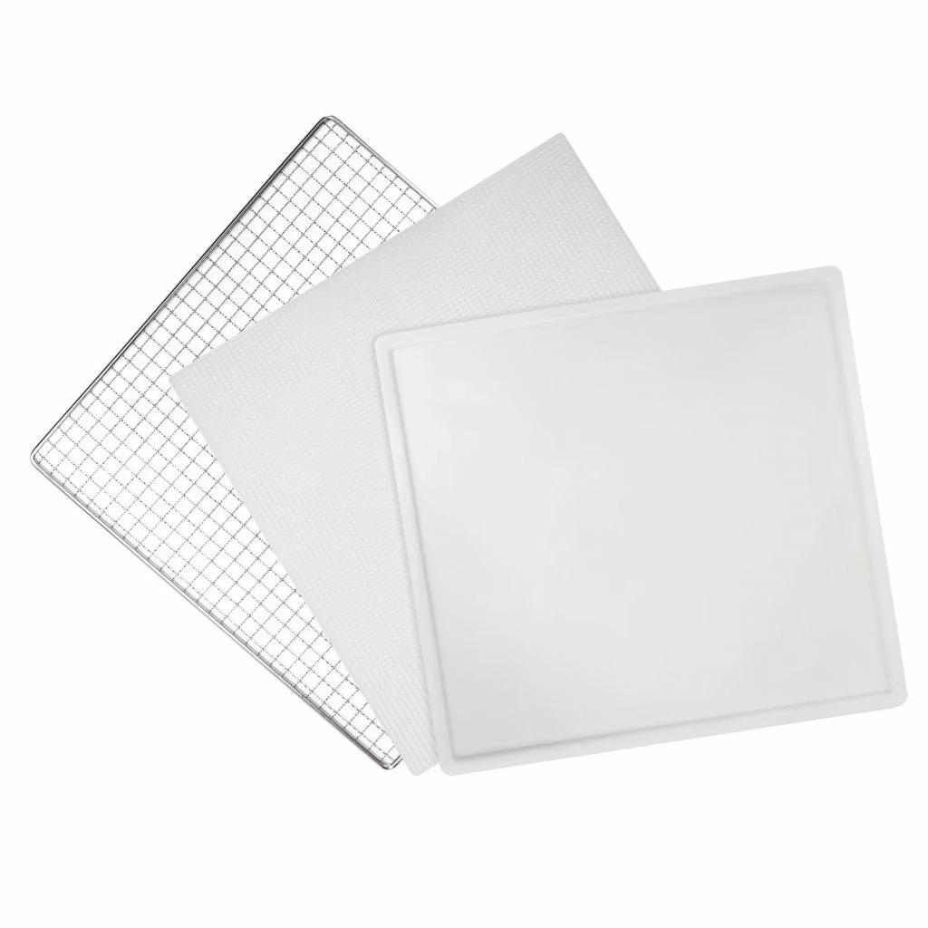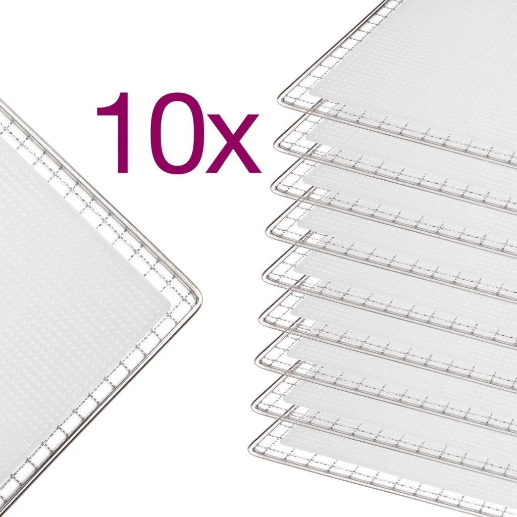 - 10 tray lines with a delicate mesh to dry the more delicate and stuck ingredients (eg mushrooms, herbs, bananas, tomatoes, etc.)