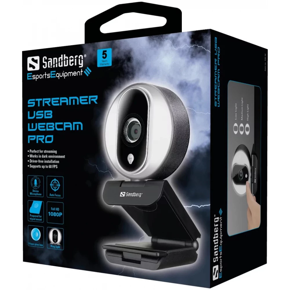 The Sandberg Streamer USB Webcam Pro is the perfect webcam for streaming, gaming or just chatting with friends online. Thanks to the full HD 1080P resolution, the camera produces super sharp images at 30 FPS, or full 60 FPS with 720P resolution. The camera also offers extra features such as autofocus and automatic exposure correction. The camera itself is located in a circle of light, where the backlight can be adjusted by touch. The stereo microphone built into the camera enables optimal sound reproduction.