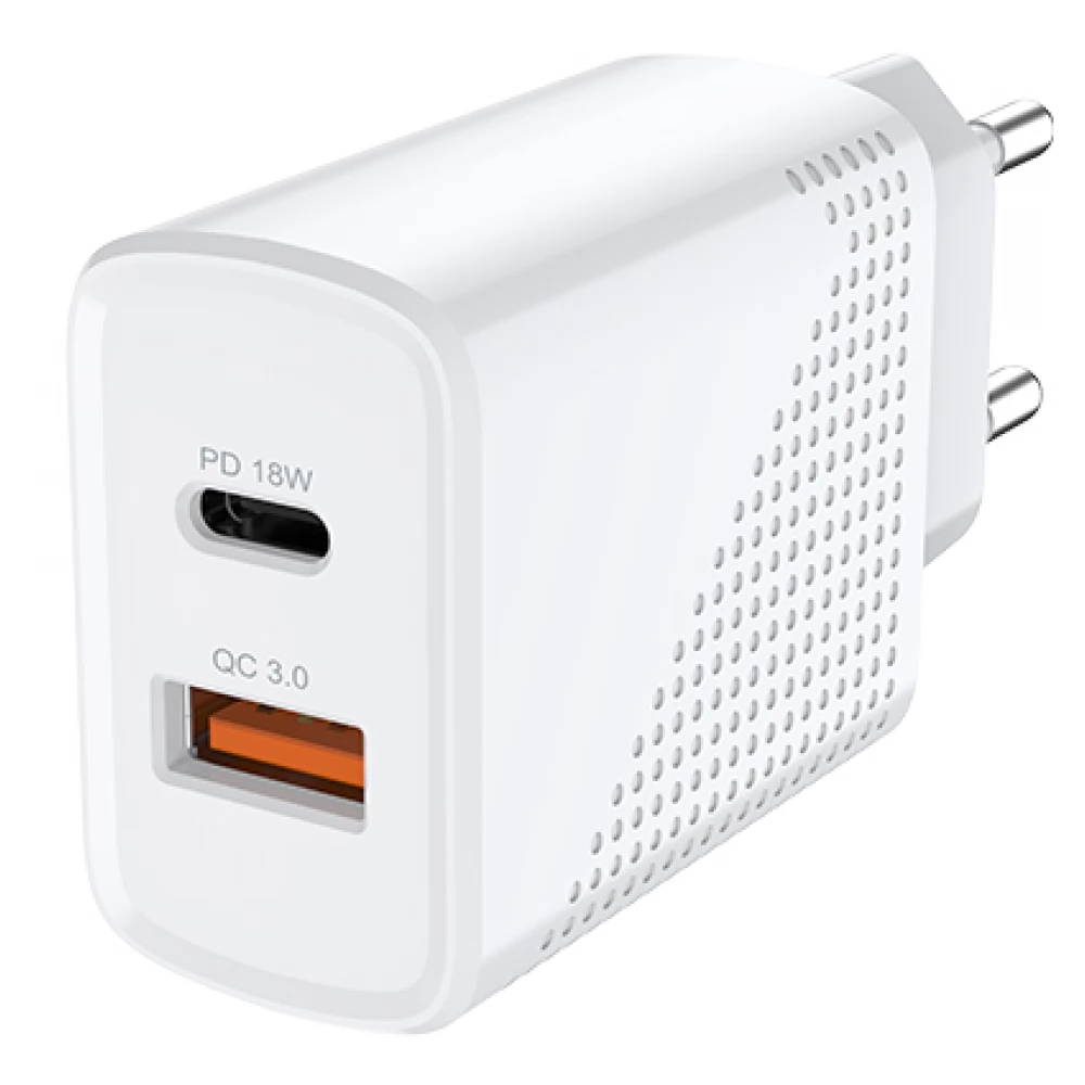 18 Watt mains charger with USB and USB Type C connection.