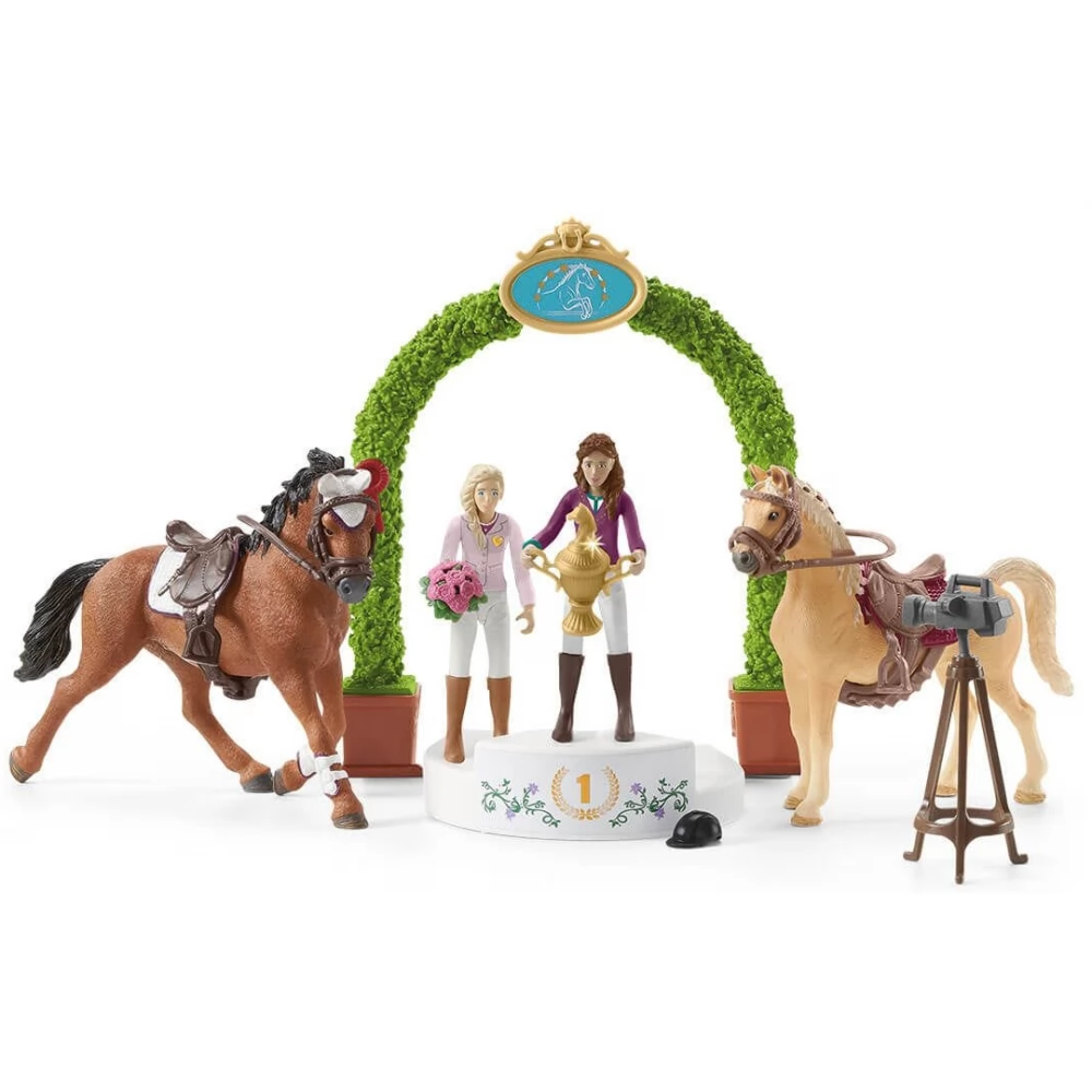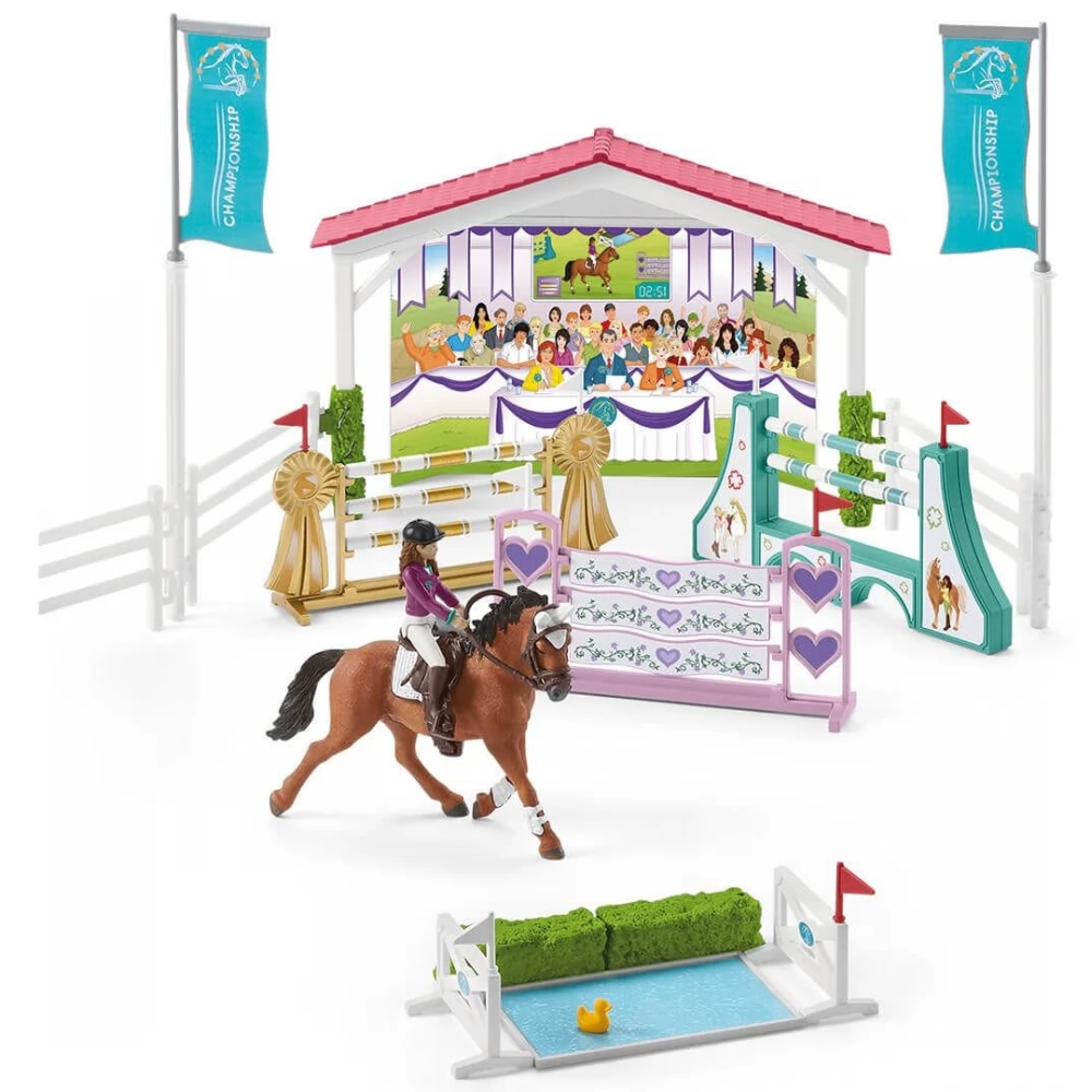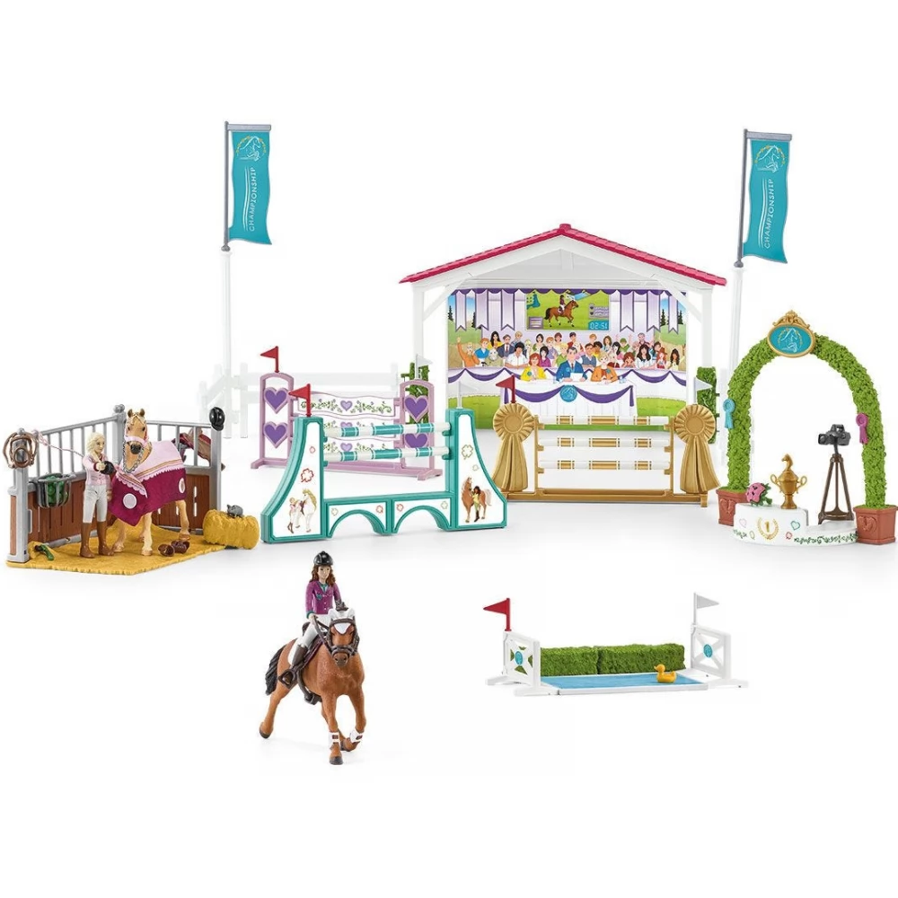 Sofia and Lisa ride an Arabian and a Trakehner mare at the Schleich horse race. Various game options and plenty of accessories ensure great fun. The detailed girl figures use the horse care accessories included in the set to groom their horses before the race, as well as equip them, so when they're next, they're ready to race right away. The riding track is surrounded by a fence, and there are obstacles of different difficulty on the track, and there is even a moat on the track. After the competition, the participants will receive a bouquet of flowers as a souvenir, and the winner will be richer with a cup, which he can receive from the jury on the podium.