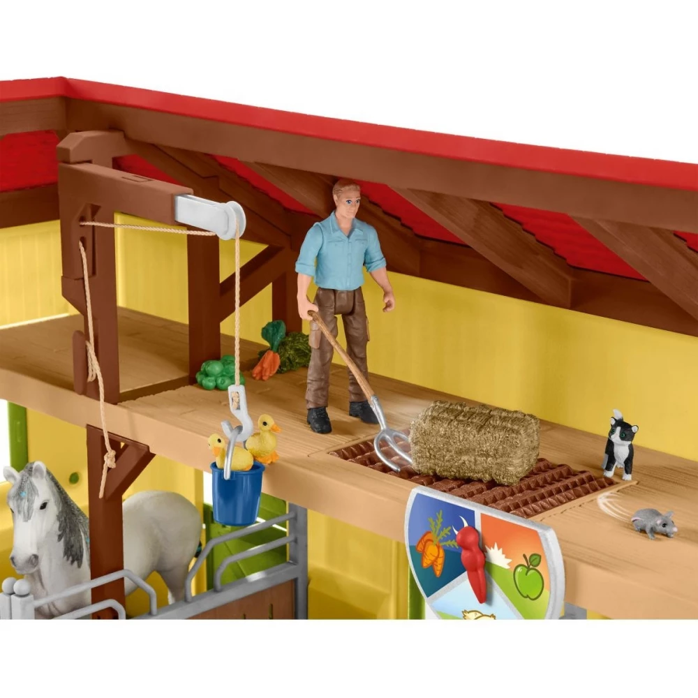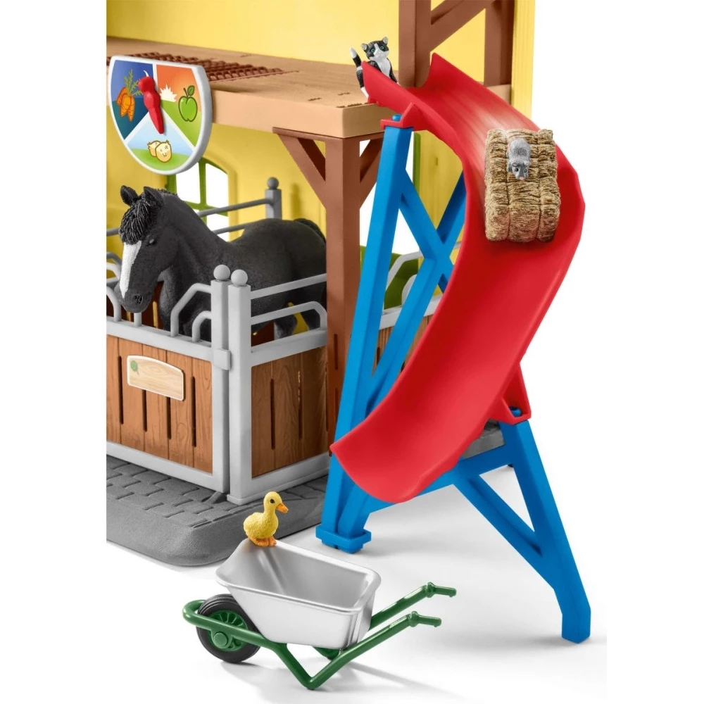 The new, colorful Schleich horse stable offers endless entertainment for horse enthusiasts with its many fun features! With 7 cute animals, 2 horse boxes and the two farmers, Paul and Laura. Of course, it contains many accessories that make it easy to play the daily work on the farm. While the farmer's wife prepares to ride, farmer Paul uses the hoist to load the feed into the hayloft. When the animals need hay, the transport rollers easily transport the hay bales to the feed chute so that they can slide down it and finally fall into the wheelbarrow. The feed indicator can be set gradually depending on when and what kind of feed the animals need.